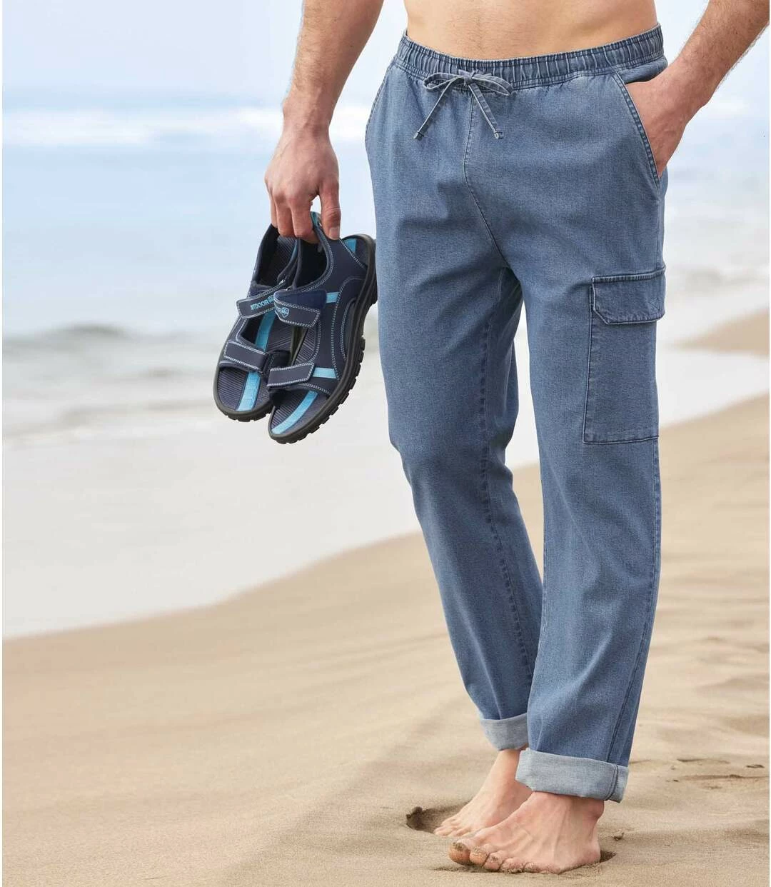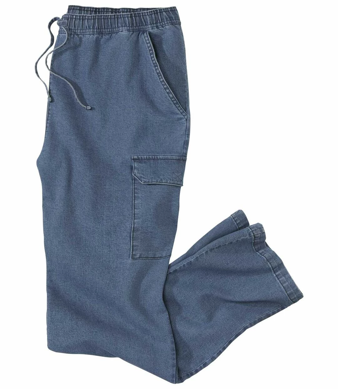 Jeans Entspannung im Cargo-Look: Genießen Sie die entspannten Momente am Wochenende oder im Urlaub in dieser Freizeithose mit Elastikbund! Sie ist aus leichtem Stretch-Denim (9,5 oz) und lässt sich kinderleicht mit der außenliegenden Verstellkordel individuell anpassen. Die Hose hat 2 Einstecktaschen vorne und 1 Cargo-Tasche mit Klettklappe auf dem linken Oberschenkel. 98% Baumwolle, 2% Elasthan. Schrittlänge bei Größe L: ca. 84 cm, Fußweite: ca. 22 cm. Maschinenwaschbar bei 30°. Farbe: Ausgewaschenes Blau – Art.-Nr.: H7136