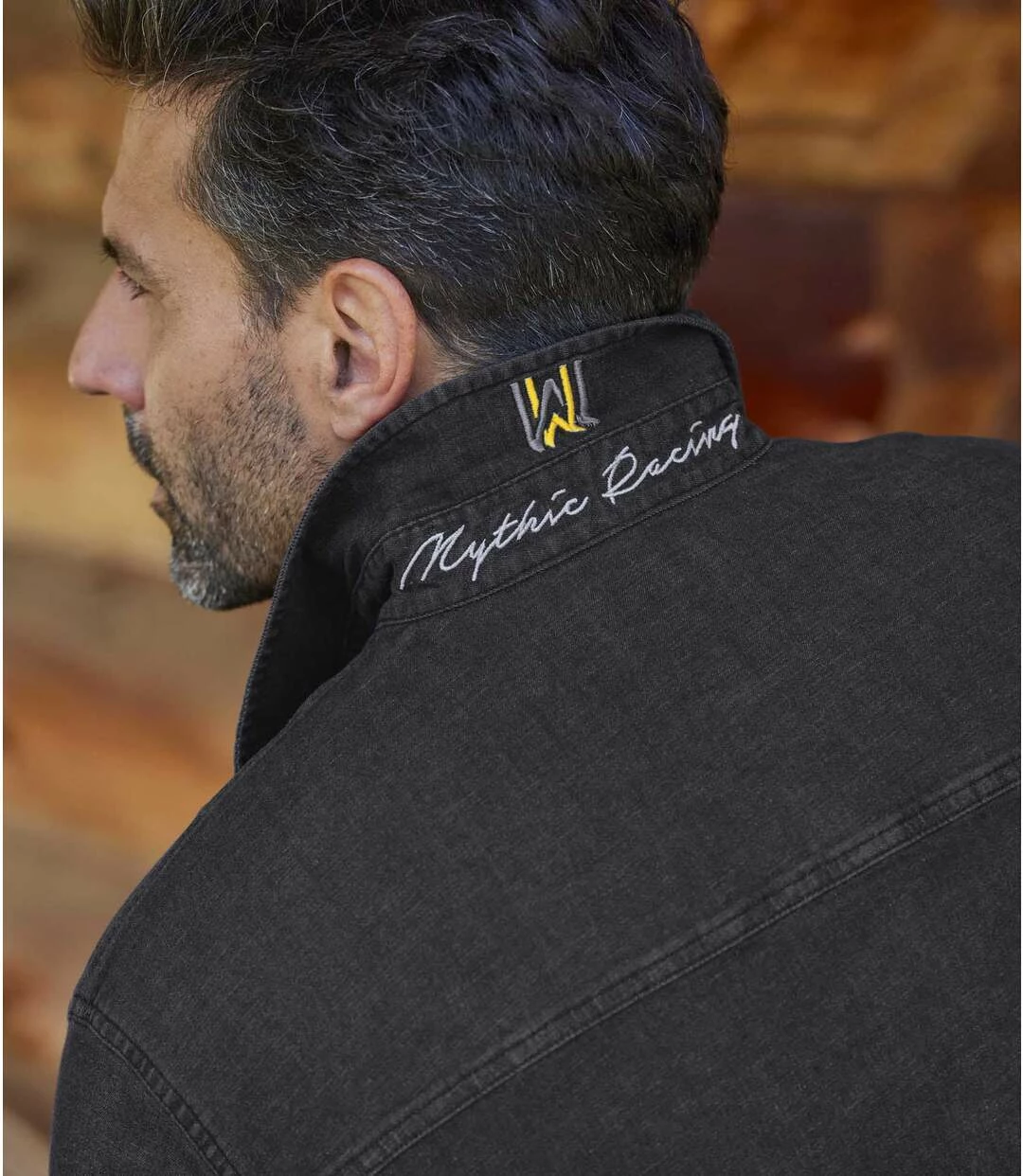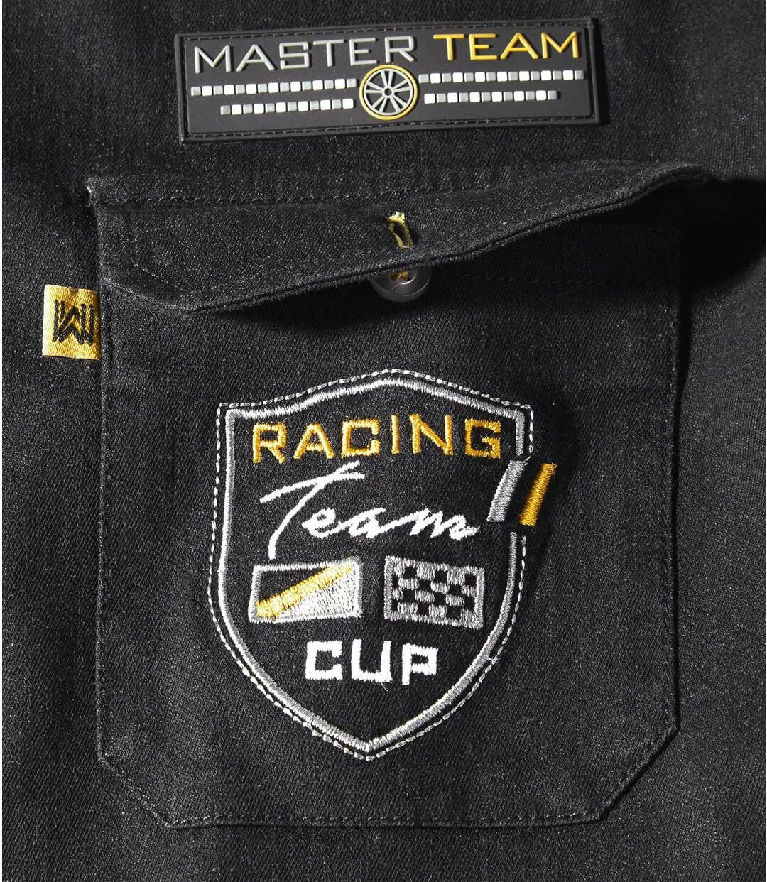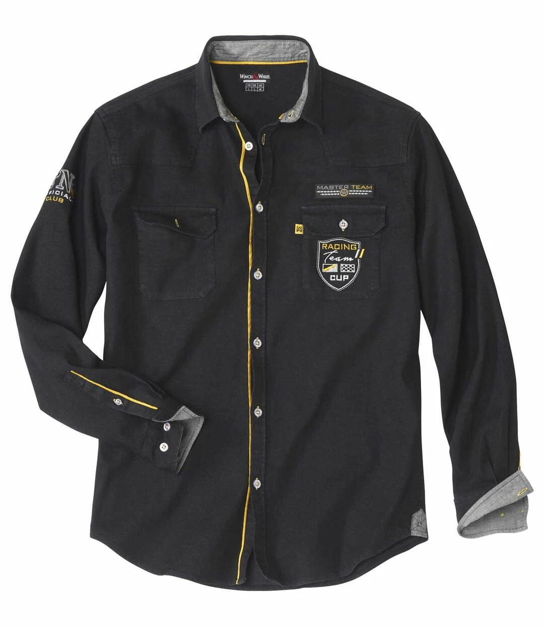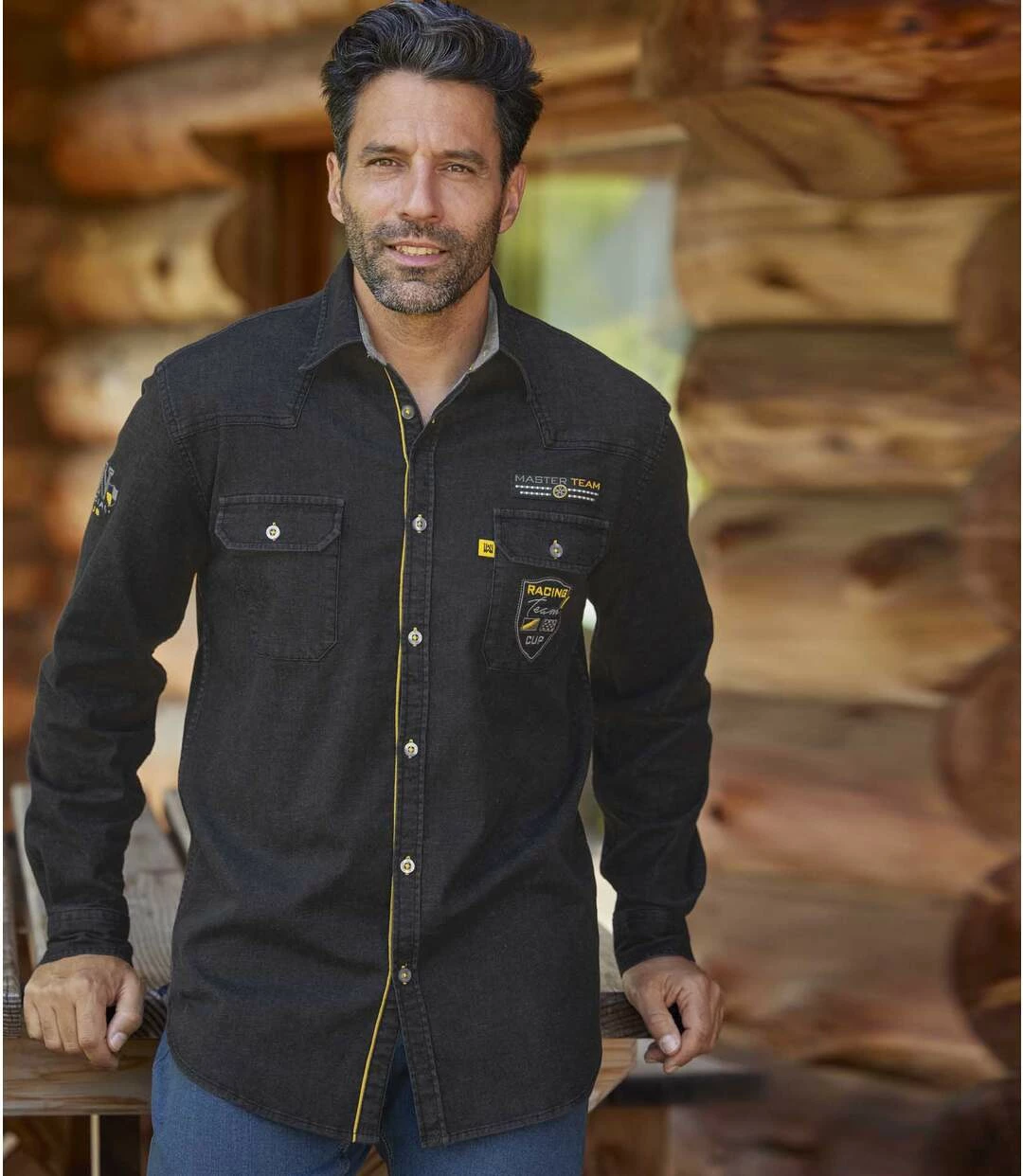 Jeans-Hemd Racing Team: Hier kommt ein sportlich-elegantes Jeans-Hemd (7,1 oz) mit vielen optischen Akzenten aus der Welt der Rennsports: Stickereien am Oberarm und auf der Unterseite des Kragens, 1 Brusttasche mit Knopfklappe und Webetikett sowie Stickereien. Dank der Beimischung von Elasthan trägt sich der hochwertige Denim ausgesprochen angenehm! Hervorragende Verarbeitungsqualität: Kentkragen, Knopfmanschetten, Rückenpasse, abgerundeter Saum. Ein hochwertiges Modell bis ins Detail: Kontrastpaspel im Kragen, an den Ärmelschlitzen und entlang der Knopfleiste, Chambray-Einsätze im Nacken und auf den Innenseiten der Manschetten. Rückenlänge bei Größe L: ca. 81 cm. Maschinenwaschbar bei 30°. Farbe: Schwarz.