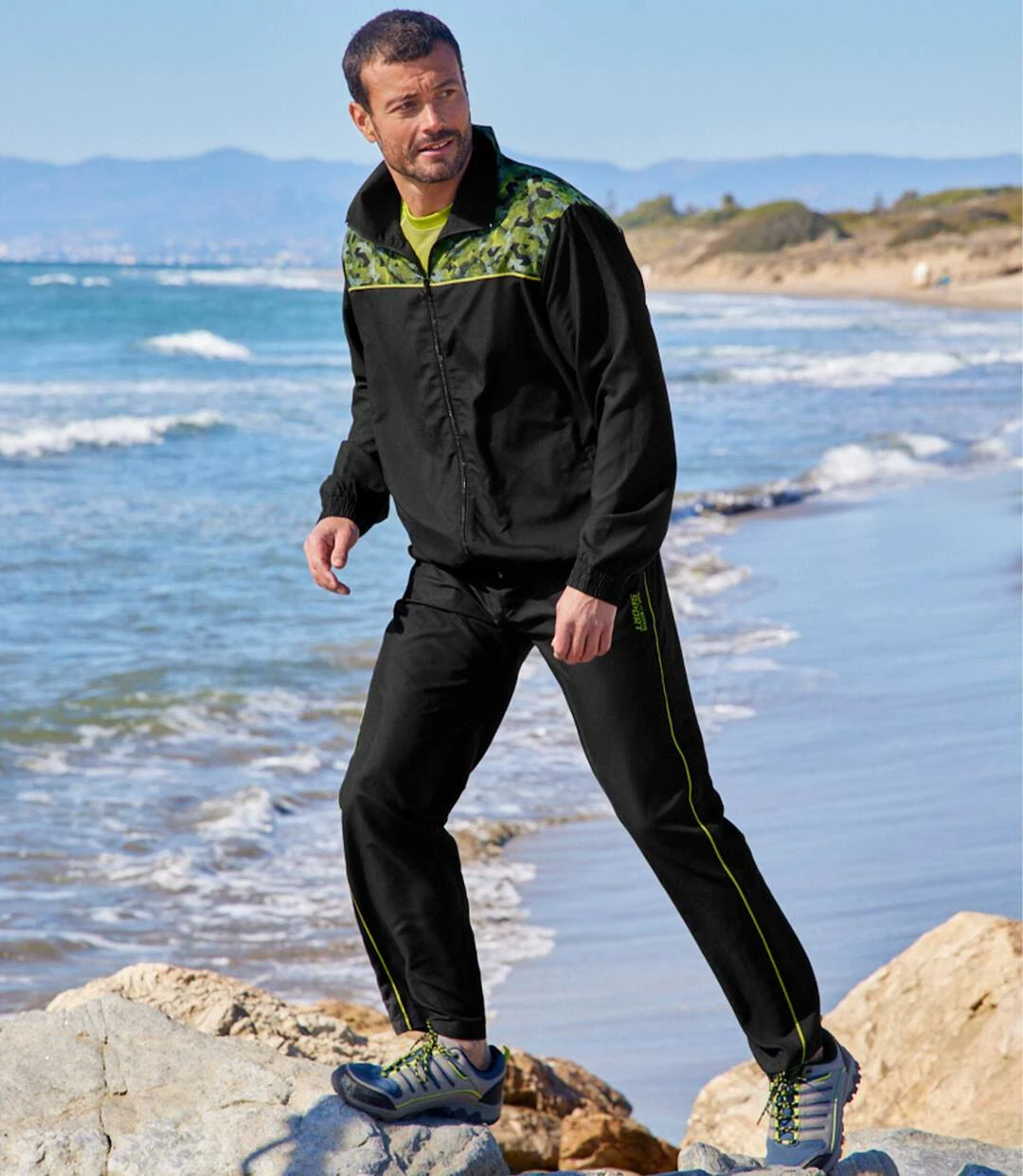 Jogging-Anzug aus Microfaser für den Sommer: Dieser extrem leichte Jogging-Anzug aus Microfaser (ca. 110 g/m²) besticht durch sein Design: Einsätze mit Graphik-Motiv auf Vorder- und Rückseite der Schultern sowie Zierpaspeln in Kontrastfarbe an den Schultereinsätzen und entlang der Seitennaht der Hose. Die Jacke hat einen hochschließenden Reißverschluss-Kragen, 2 Reißverschluss-Taschen sowie Elastikpaspeln an den Ärmeln und am Saum. Die superbequeme Hose ist mit einen Elastikbund inkl. Verstellkordel sowie 2 seitliche Einstecktaschen ausgestattet. 100% Polyester. Rückenlänge bei Größe L: ca. 74 cm, Schrittlänge : ca. 81 cm, Fußweite: ca. 22 cm. Maschinenwaschbar bei 30°. Bügelfrei. Farbe: Schwarz.