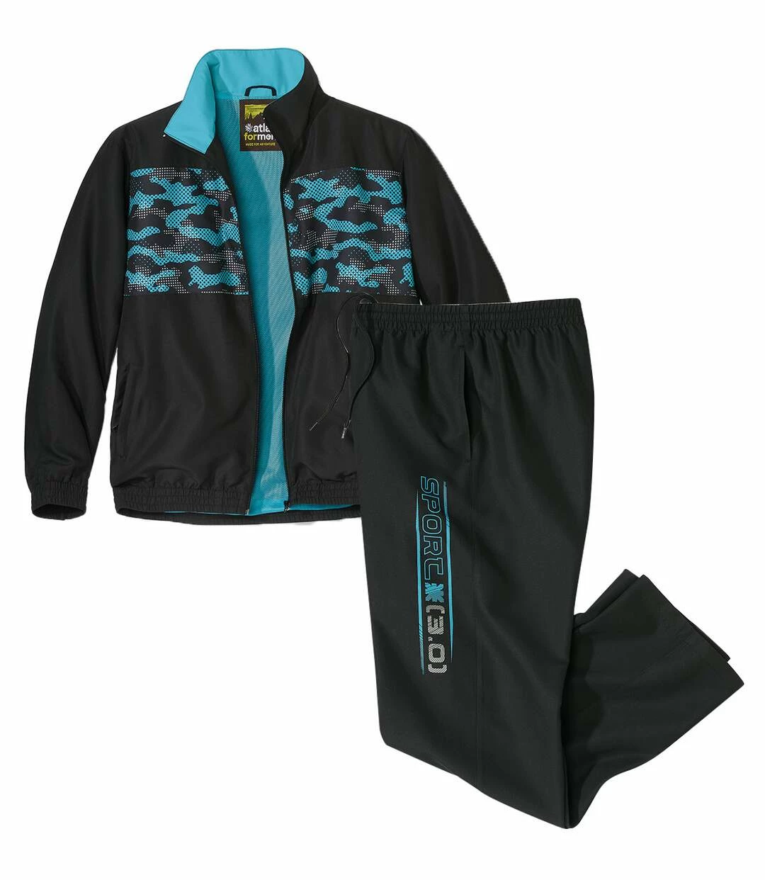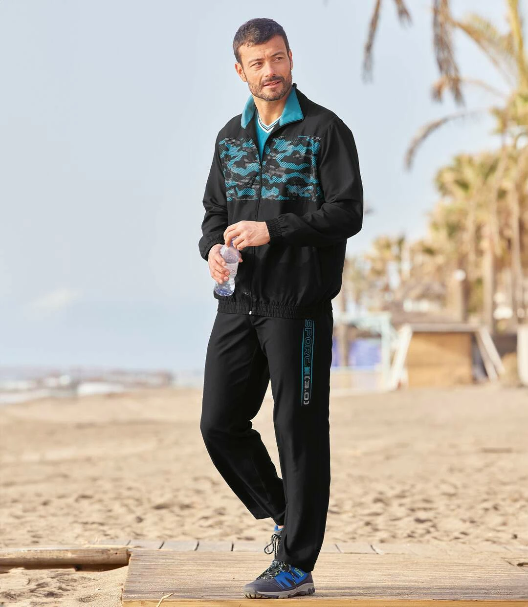 Jogging-Anzug im Camouflage-Look: Der Einsatz mit dem blauen Camouflage-Muster auf der Jacke ist ein echter Hingucker bei diesem praktischen und extrem bequemen Jogging-Anzug aus leichter Microfaser (ca. 110 g/m²). Die Jacke mit durchgehendem Reißverschluss ist im Körperbereich mit Mesh gefüttert, in den Ärmeln mit Taft. Sie hat 2 Reißverschlusstaschen und Elastikbündchen an den Ärmeln und am Saum. Die Hose mit Elastikbund inkl. innenliegender Verstellkordel hat 2 Seitentaschen. Kontrastdetails: Krageninnenseite und Aufdruck Sport am Saum. 100% Polyester. Rückenlänge bei Größe L: ca. 74 cm. Schrittlänge: ca. 81 cm, Fußweite: ca. 22 cm. Maschinenwaschbar bei 30°. Farben: Schwarz, Details in Türkis – Art.-Nr.: K1168