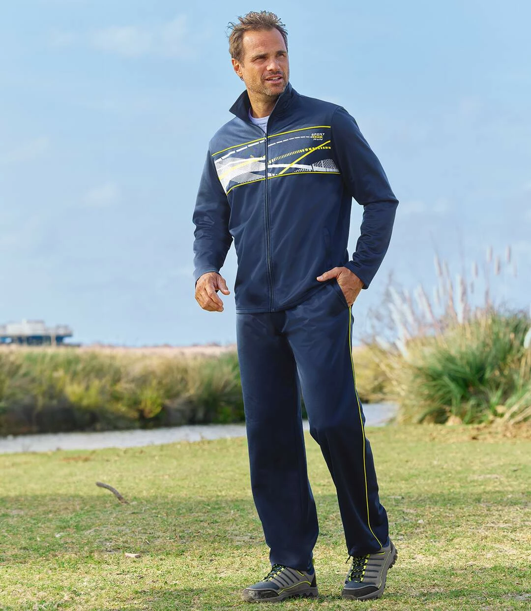 Jogging-Anzug mit Brustaufdruck: Damit Sie die frische Frühlingsluft beim Joggen oder in der Freizeit optimal genießen können, empfehlen wir Ihnen diesen Jogging-Anzug. Das extrem bequeme Modell wird aus weichem und pflegeleichtem Material (ca. 190 g/m²) hergestellt. Der hochschließende Kragen isoliert gut, die 2 Seitentaschen sind praktisch. Die Hose trägt sich dank des Elastikbunds inkl. Verstellkordel sehr angenehm. Für den sportiven Look sorgen Kontrastdetails: Paspeln im Brustbereich und entlang den Seitennähten der Hosenbeine sowie ein Brustaufdruck. Die Jacke ist mit Doppelnähten verarbeitet. Nackenband. 100% Polyester. Rückenlänge bei Größe L: ca. 75 cm, Schrittlänge: ca. 81 cm, Fußweite: ca. 22 cm. Maschinenwaschbar bei 30°. Bügelfrei. Farben: Dunkelblau, Details in Anisgrün und Weiß – Art.-Nr.: L2143
