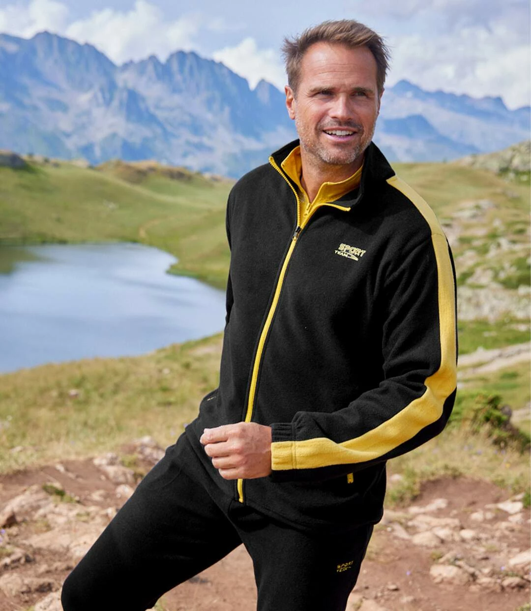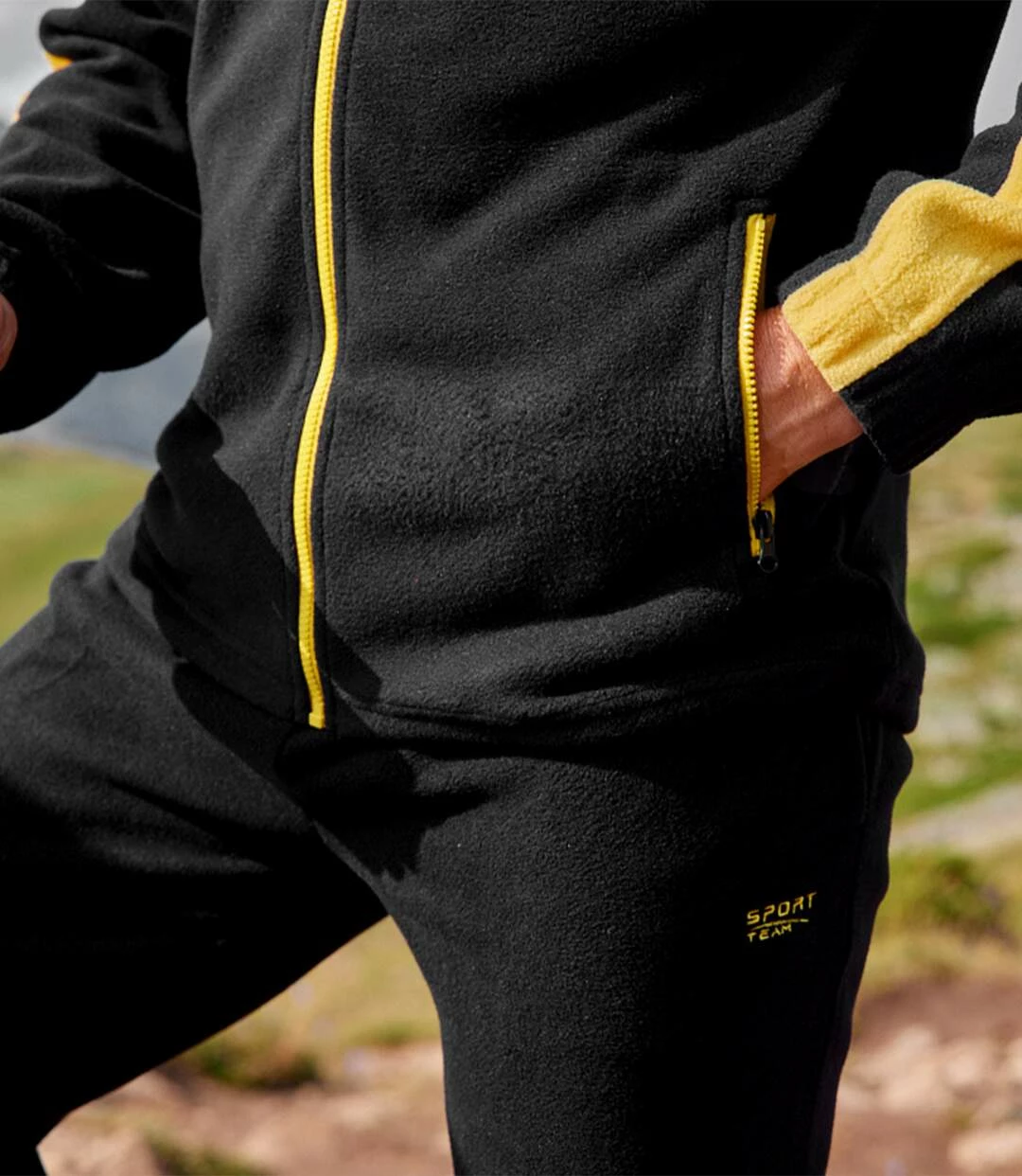 Jogging-Anzug Winter aus Fleece: Für Sport und Freizeit im Winter empfehlen wir diesen Jogging-Anzug aus warmem und weichem Fleece (ca. 210 g/m²). Dank hochschließendem Kragen, und verstellbarem Saum mit Kordel und Stoppern bietet die Jacke perfekte Isolierung. 2 Seitentaschen mit Reißverschluss. Die superbequeme Hose hat einen Elastikbund mit Verstellkordel und 2 Seitentaschen. Absolut sportiver Look dank gelbem Dekorband an den Ärmeln, sowie Stickereien und Reißverschluss in Gelb. Verarbeitung mit Doppelnähten. Rückenlänge bei Größe L: ca. 74 cm, Schrittlänge: ca. 84 cm, Fußweite: ca. 22 cm. Maschinenwaschbar bei 30°. Farben: Schwarz, Details in Gelb.