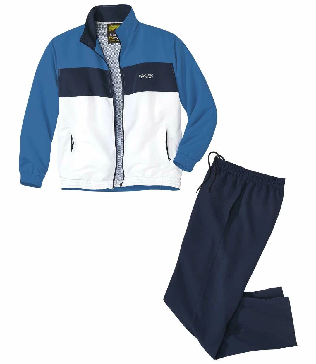 Jogginganzug für den Sommer aus Microfaser: Für den Sommer empfehlen wir Ihnen diesen Jogginganzug aus leichter und unkomplizierter Microfaser (ca. 110 g/m²). Die gut isolierende Jacke mit durchgehendem RV hat Elastikbündchen an den Ärmeln und Saum. Sie ist im Körperbereich mit einem Netzfutter und in den Ärmeln mit Taftfutter ausgestattet. 2 praktische RV-Taschen. Die Hose garantiert dank des Elastikbunds inkl. innenliegender Verstellkordel perfekten Komfort, sie hat ebenfalls 2 Seitentaschen. Dieser Jogginganzug eignet sich für den Sport oder die entspannten Momente. 100% Polyester. Rückenlänge bei Größe L: ca. 74 cm, Schrittlänge: ca. 81 cm, Fußweite: ca. 22 cm. Maschinenwaschbar bei 30°. Schnell trocknend. Bügelfrei. Farben: Dunkelblau, Azurblau und Weiß – Art.-Nr.: G3101