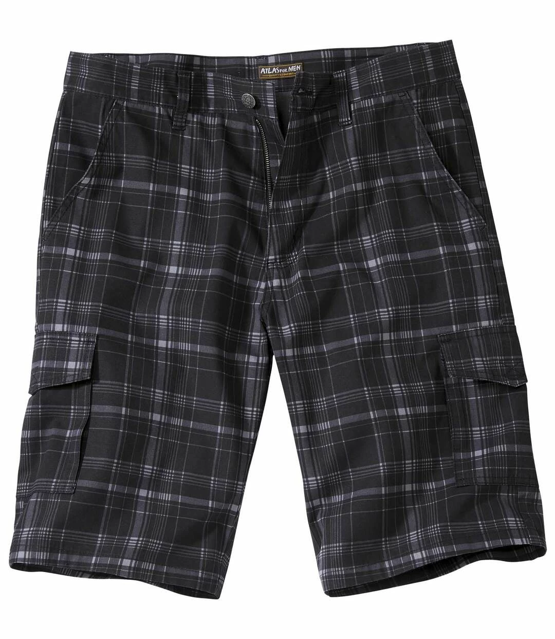 Karierte Cargo-Bermuda: Diese karierte Cargo-Bermuda aus solidem Canvas (ca. 200 g/m²) verbindet lässigen Stil mit einem sommerlichen Tragegefühl. Die Bermuda hat 6 praktische Taschen: 2 Einstecktaschen vorne, 2 aufgesetzte Gesäßtaschen und 2 seitliche Beintaschen mit Klettklappen. Bund mit Schlaufen. 100% Baumwolle. Schrittlänge bei Größe 50: ca. 32 cm, Beinweite: ca. 28 cm. Maschinenwaschbar bei 30°. Farbe: Schwarz mit Karos – Art.-Nr.: E6115