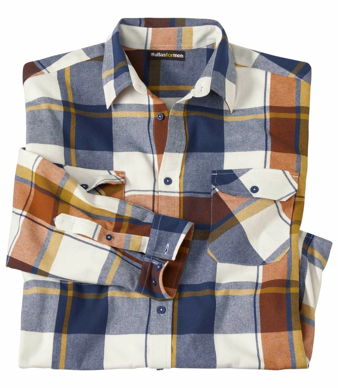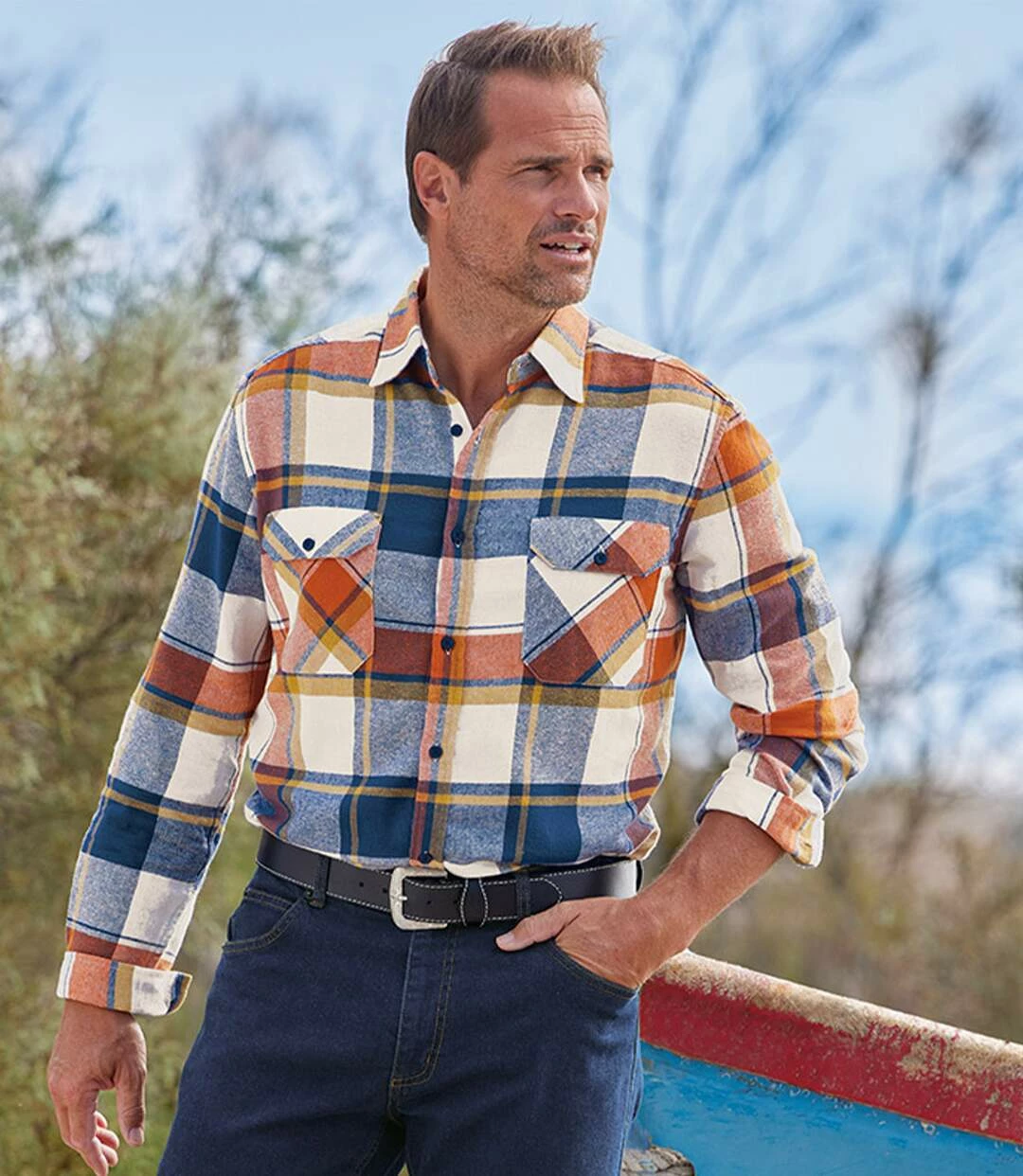 Kariertes Flanell-Hemd Country: In diesem Hemd aus flauschigem Flanell (ca. 160 g/m²) mit Webkaros werden Sie sich bestimmt wohlfühlen. Gerade im Herbst und Winter trägt sich dieses Hemd sehr angenehm, entweder direkt auf der Haut oder über einem passenden T-Shirt. Weiter und bequemer Schnitt mit sorgfältiger Verarbeitung: Kentkragen, Knopfmanschetten, 2 Brusttaschen mit Knopfklappen, 2 Bewegungsfalten im Rücken und abgerundetem Saum. Dunkelblaue Knöpfe. 100% Baumwolle. Rückenlänge bei Größe L: ca. 81 cm. Maschinenwaschbar bei 30°. Farben: Natur mit Karos in Blau und Orange – Art.-Nr.: K8110