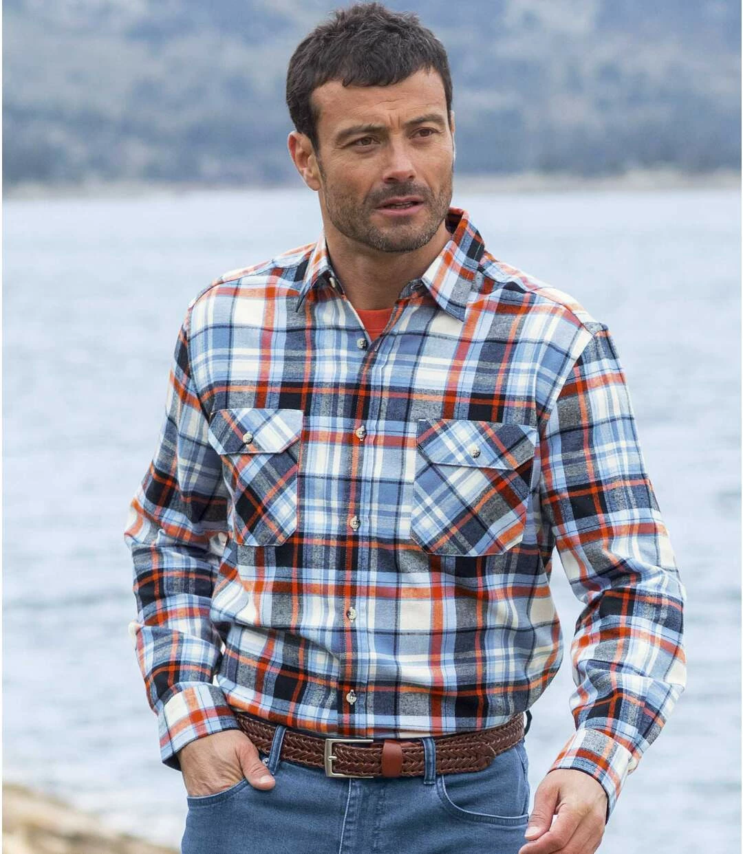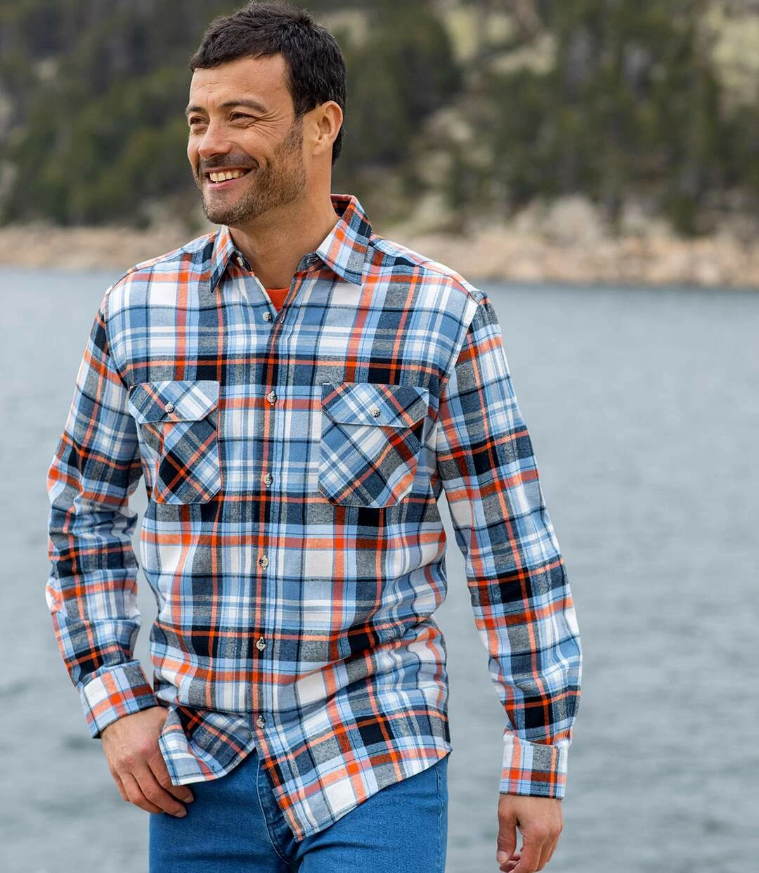 Kariertes Flanell-Hemd Indian Summer: Dieses lässige Hemd aus flauschigem Flanell (ca. 160 g/m²) mit Webkaros begeistert mit authentischem Stil. Das Modell hat 2 Brusttaschen mit Knopfklappen und ist weit und bequem geschnitten: Kentkragen und Knopfmanschetten, Rückenpasse mit 2 Bewegungsfalten, abgerundeter Saum. Knöpfe in Hornoptik. Sie können das Hemd solo tragen oder offen über einem einfarbigen T-Shirt in passender Farbe. Rückenlänge bei Größe L: ca. 81 cm. Maschinenwaschbar bei 30°. Farben : Karos in Natur, Blau und Orange.