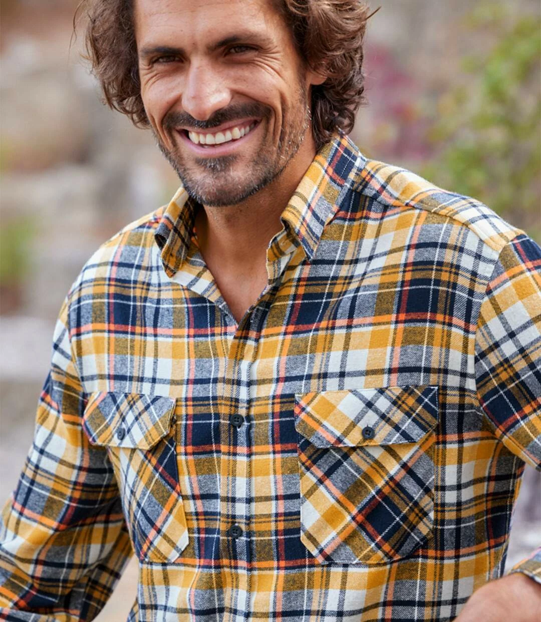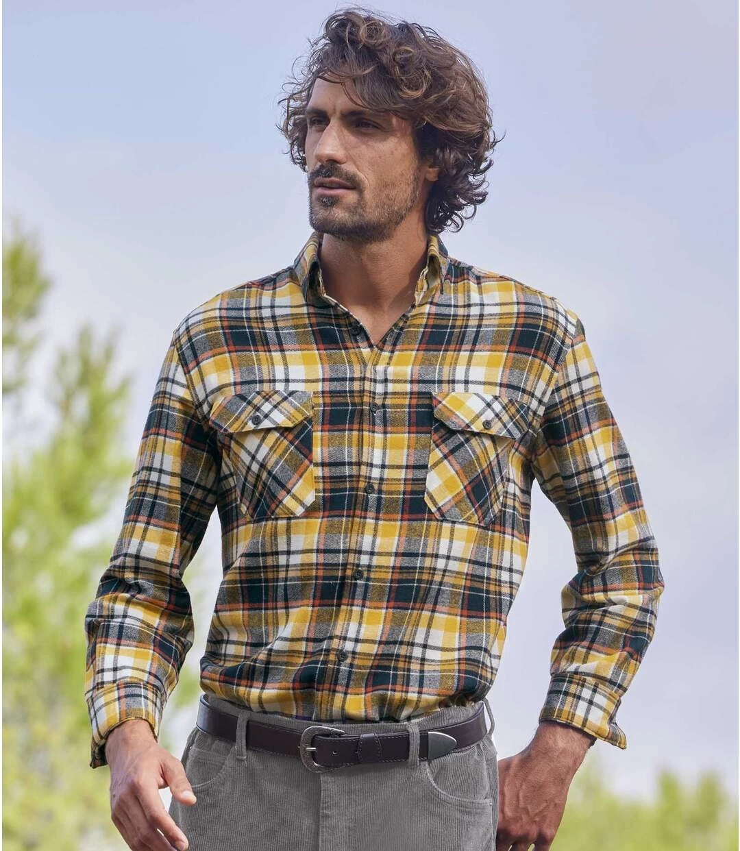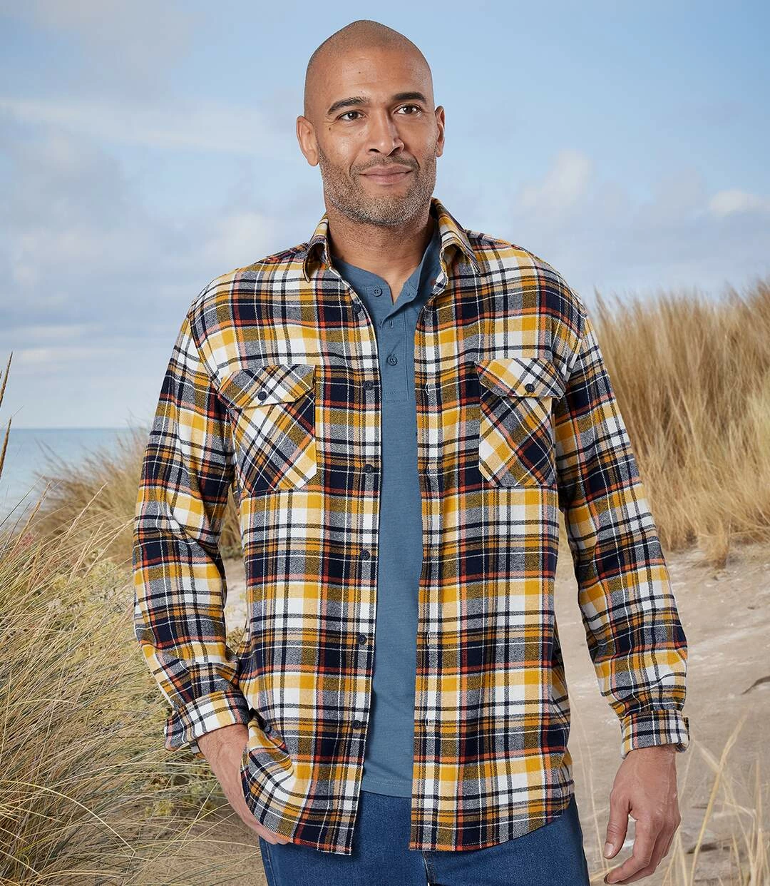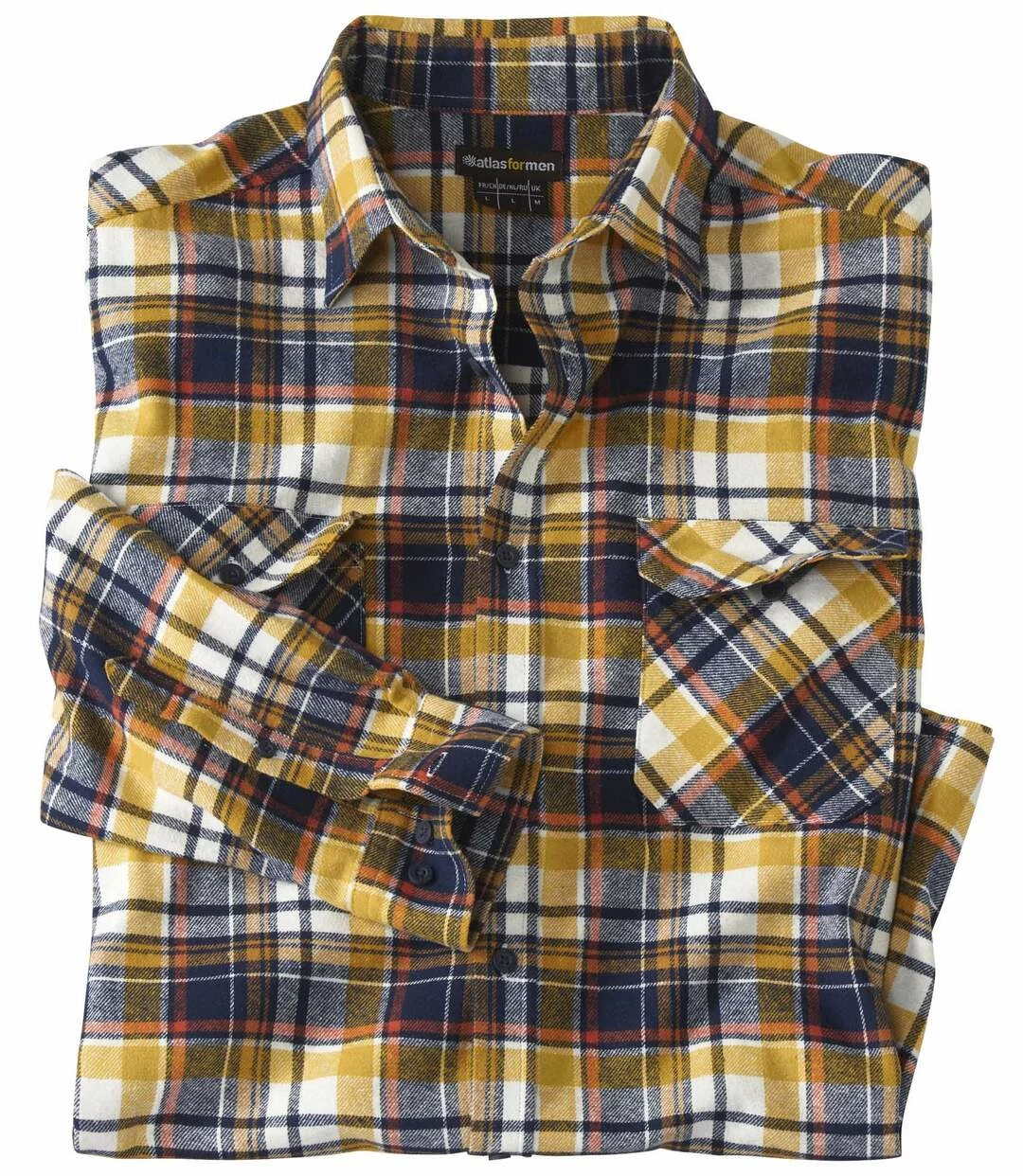 Kariertes Flanellhemd Ranch: Warm, weich und anschmiegsam – Flanell ist ein ausgesprochen bequemes Material (ca. 160 g/m²). Dieses lässige und authentische Hemd mit den Webkaros in Dunkelblau und leuchtendem Ocker und Gelb begeistert mit überzeugender Qualität: Kentkragen, Knopfmanschetten, 2 Brusttaschen mit Knopfklappen. Weiter Schnitt, 2 Bewegungsfalten im Rücken, abgerundetem Saum. Knöpfe mit Gravur. Rückenlänge bei Größe L: ca. 81 cm. Maschinenwaschbar bei 30°. Farben: Karos in Natur, Ziegelrot, Ocker und Dunkelblau.