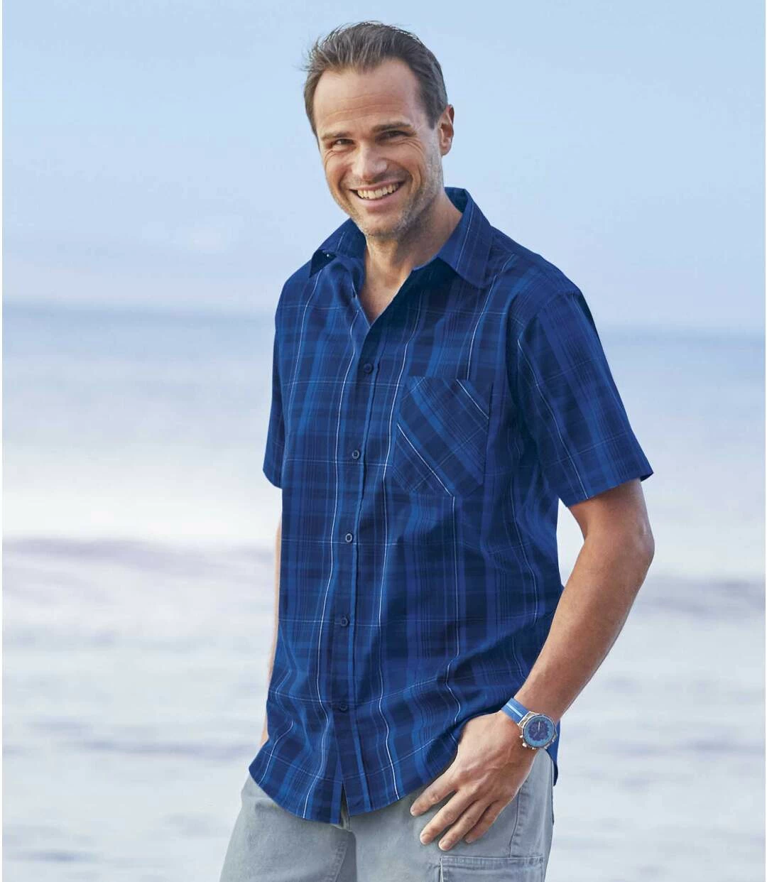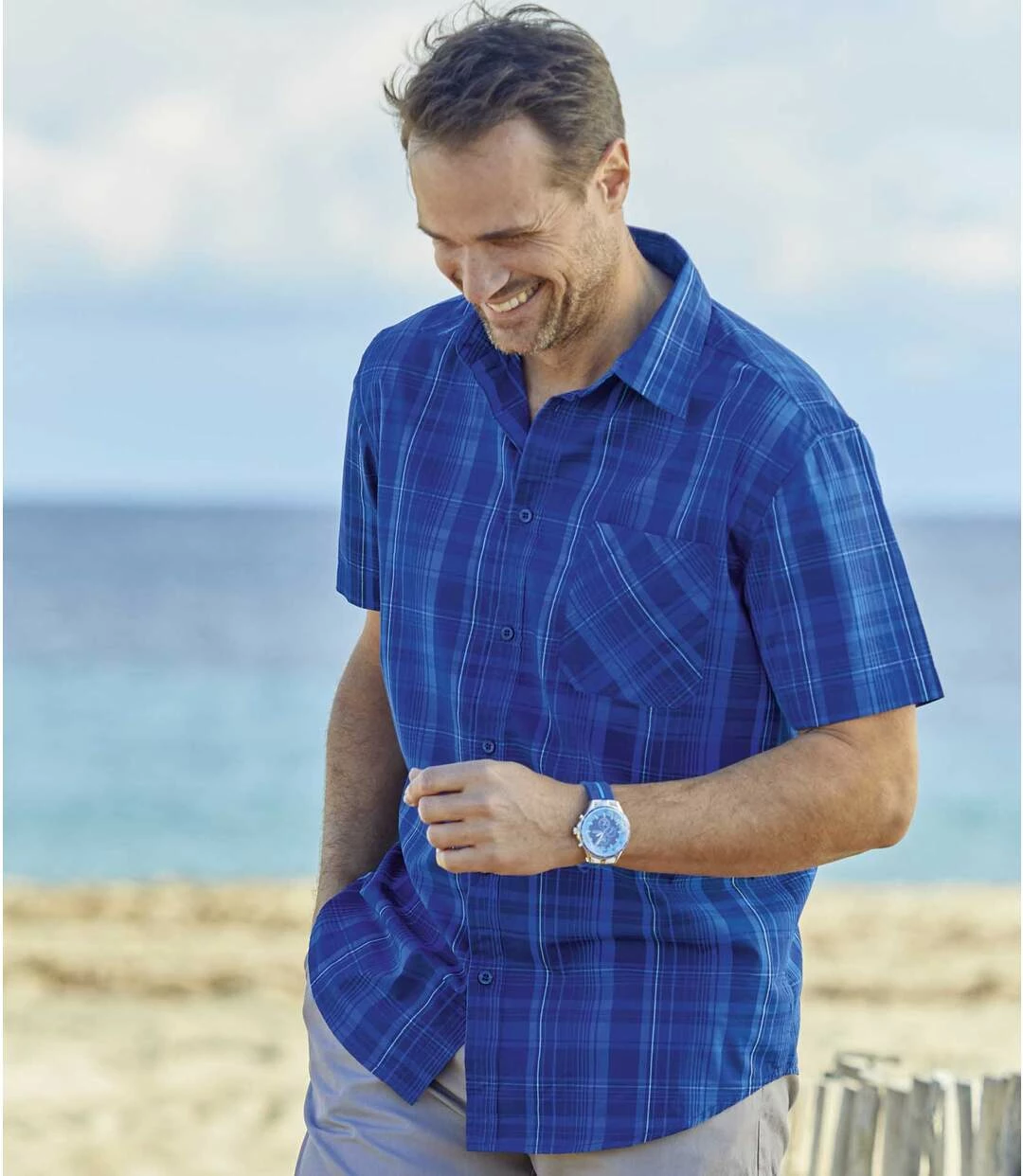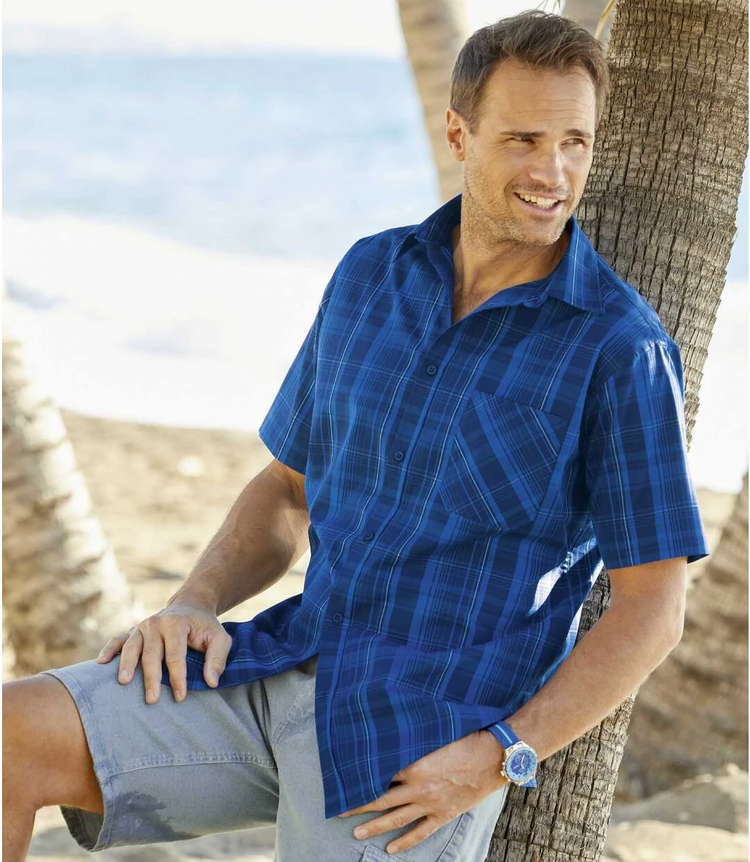 Kariertes Hemd Stretch Komfort: Dieses kurzärmelige Hemd werden Sie sehr gerne tragen, denn es ist praktisch und bequem zugleich! Der herrliche Popelin ist mit Elasthan veredelt, das garantiert perfekten Sitz und optimale Bewegungsfreiheit. Weiter Schnitt, Kentkragen, 1 Brusttasche, 2 Bewegungsfalten im Rücken, abgerundeter Saum. Ärmel und Saum mit Doppelnähten. 70% Baumwolle, 27% Polyester, 3% Elasthan. Rückenlänge bei Größe L: ca. 80 cm. Maschinenwaschbar bei 30°. Farben: Karos in Blautönen – Art.-Nr.: G0116