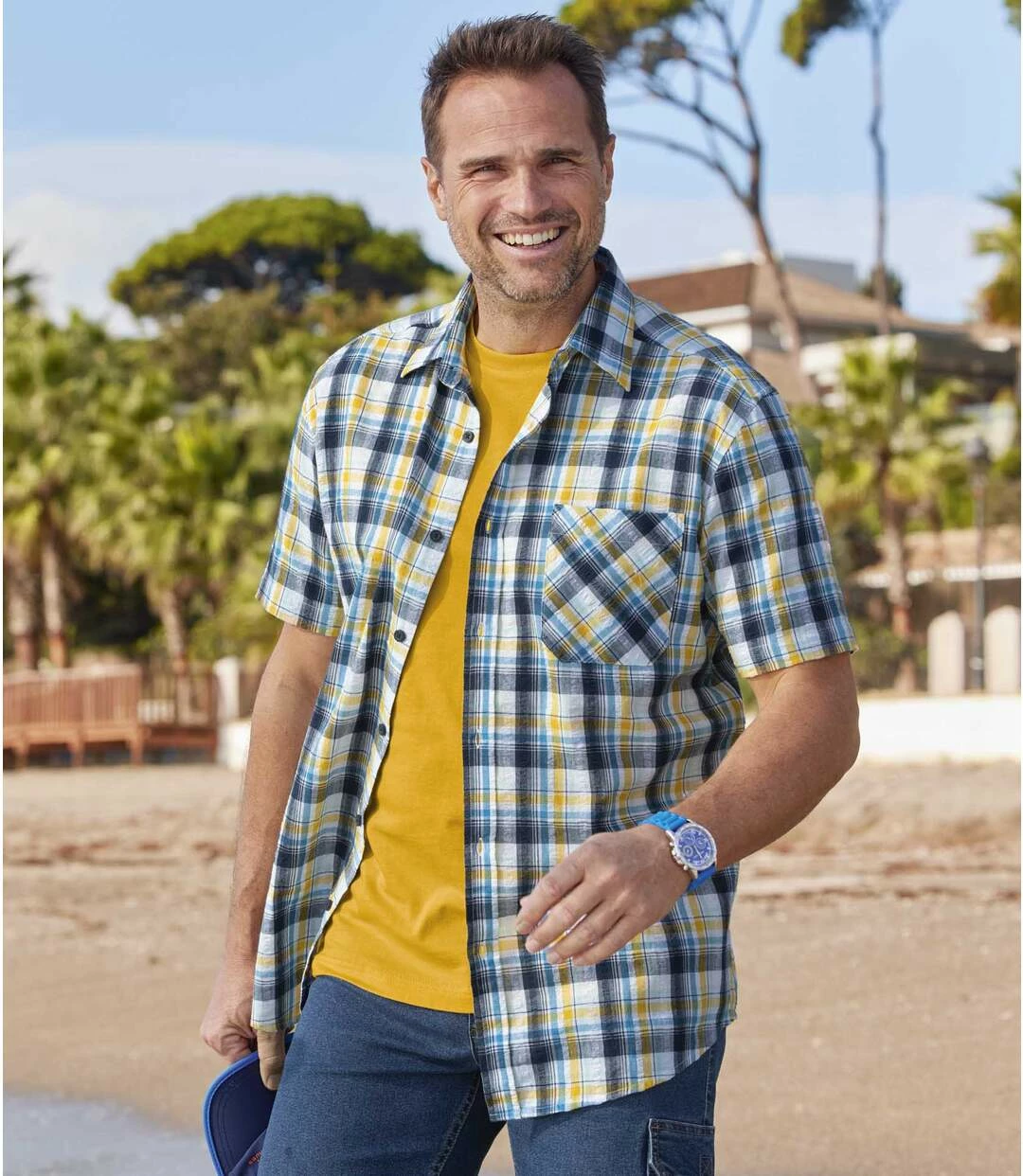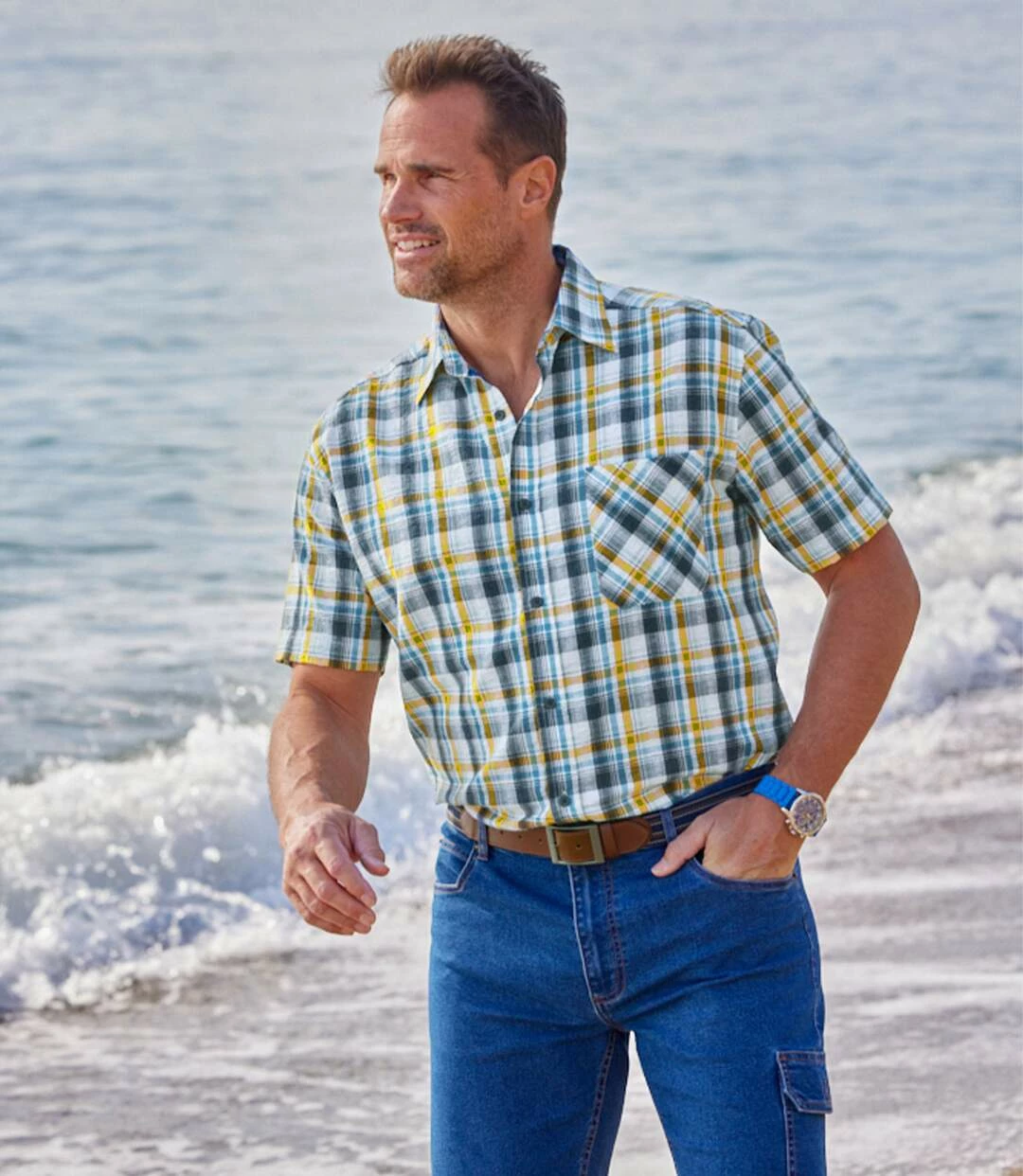 Kariertes Seersucker-Hemd mit Waffeloptik: Wenn der Wetterbericht große Hitze ankündigt, dann greifen Sie zu diesem kurzärmeligen Hemd mit Webkaros in Seersucker-Qualität! Dieser luftig-leichte Stoff mit Waffeloptik (ca. 110 g/m²) ist ideal für den Sommer und vor allem auf Reisen, denn er ist bügelfrei! Bequemer Schnitt mit Kentkragen, Rückenpasse mit 2 Bewegungsfalten, und abgerundetem Saum. Dunkelblaue Knöpfe. 100% Baumwolle. Rückenlänge bei Größe L: ca. 80 cm. Maschinenwaschbar bei 30°. Farben: Karos in Weiß, Blau, Dunkelblau und Ocker.