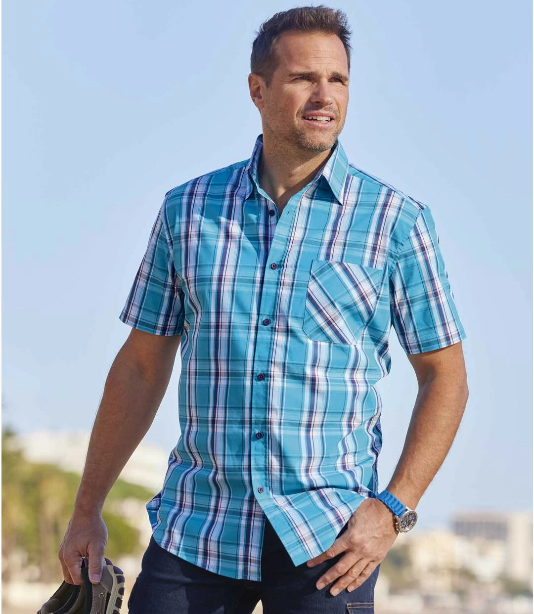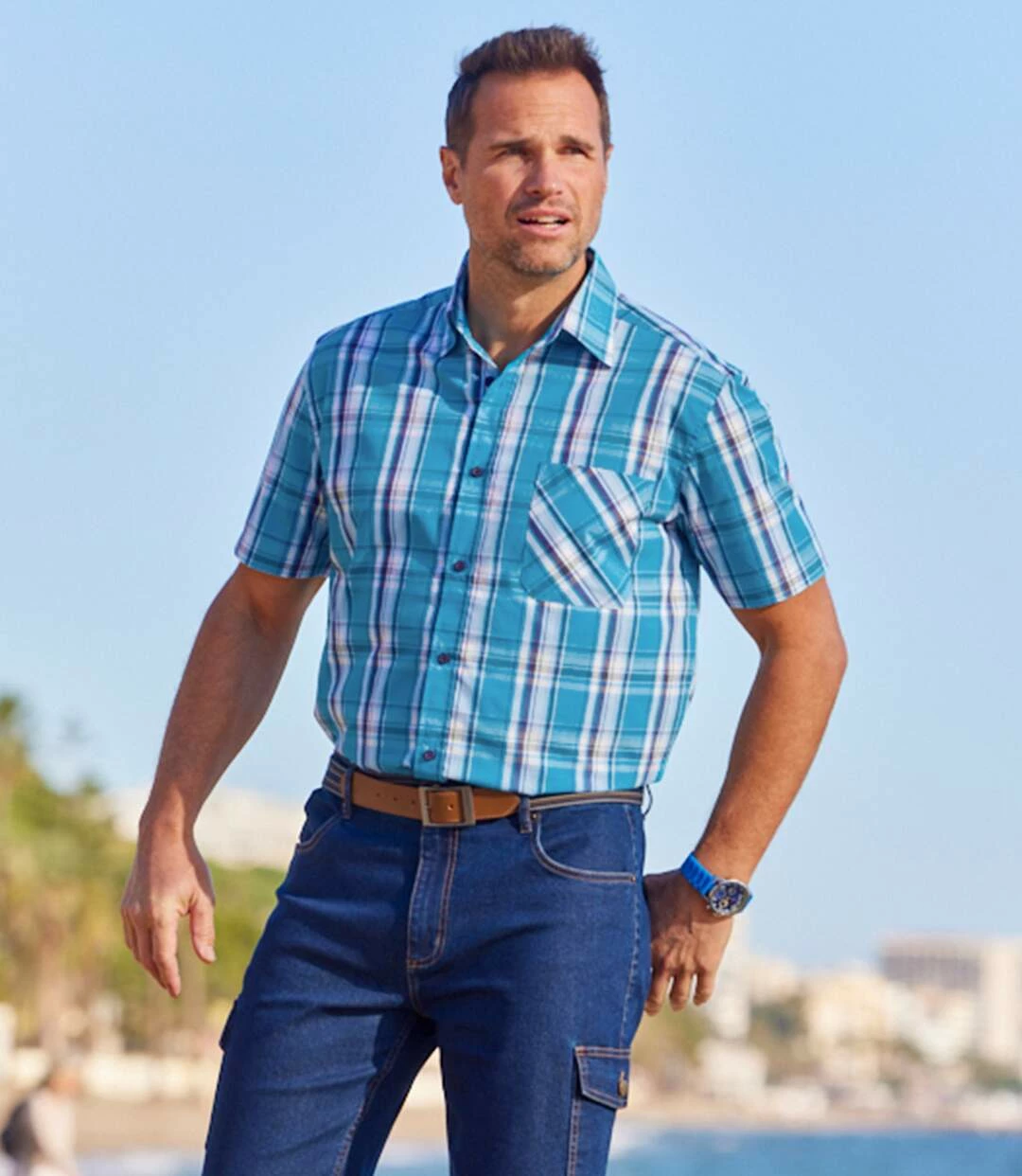 Kariertes Sommerhemd Karibik mit Stretch-Effekt: Türkis wie die Lagunen einer exotischen Karibikinsel! Dieses Hemd mit seinen leuchtenden Webkaros sieht nicht nur nach Urlaub aus, es fühlt sich auch so an. Denn es wird aus einem leicht dehnbaren Popelin (ca. 110 g/m²) gefertigt, der maximalen Tragekomfort verspricht. Einwandfreier Schnitt: 1 aufgesetzte Brusttasche, Kentkragen, 2 Bewegungsfalten im Rücken, abgerundeter Saum. Violette Knöpfe. 70% Baumwolle, 27% Polyester, 3% Elasthan. Rückenlänge bei Größe L: ca. 80 cm. Maschinenwaschbar bei 30°. Farben: Türkis mit Karos.