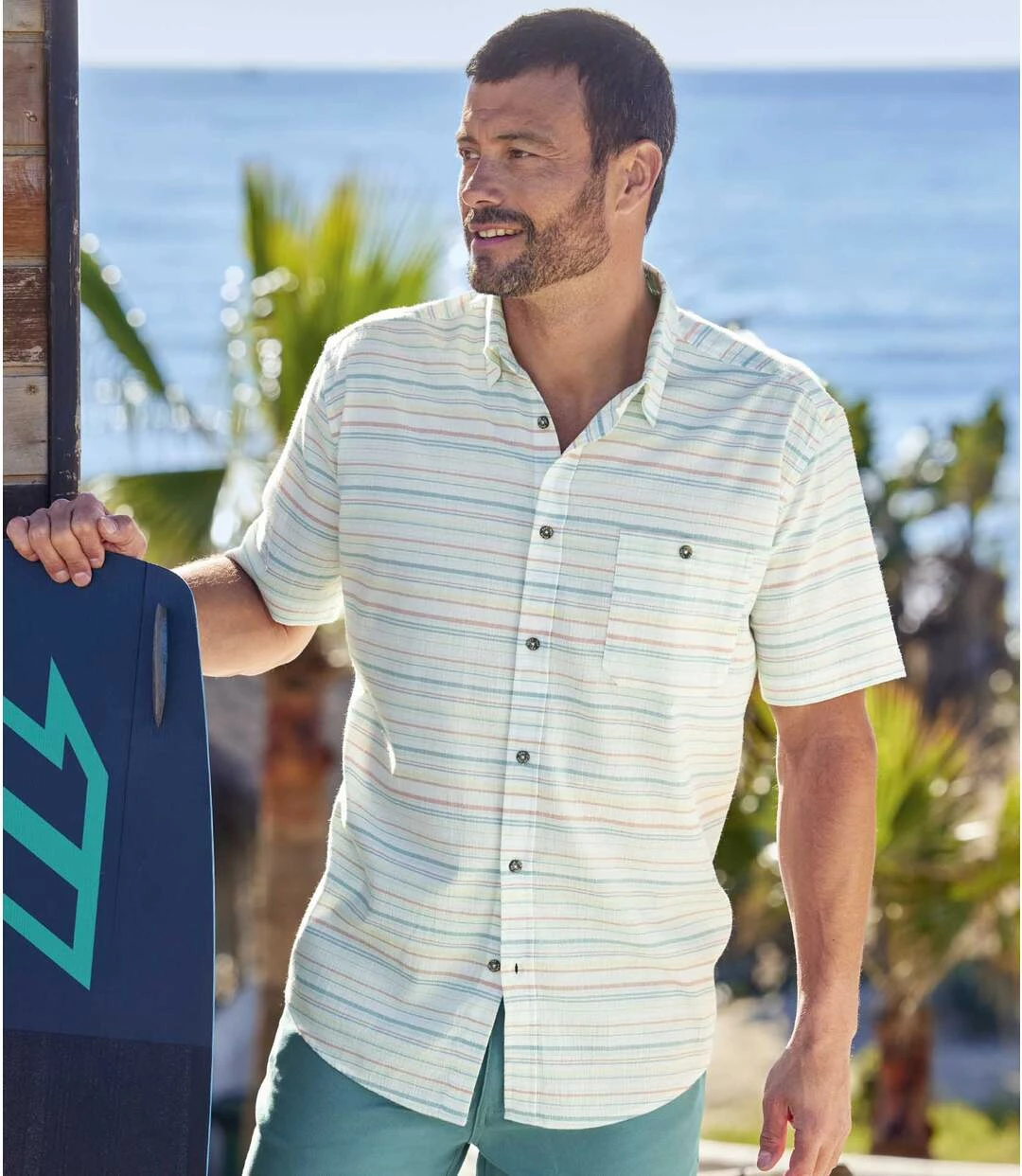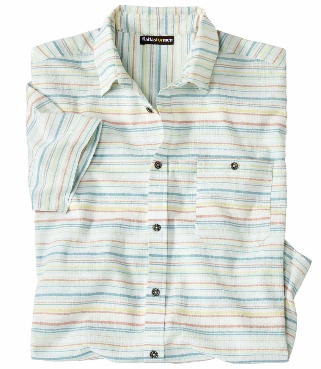 Kurzärmeliges Hemd Summer aus gestreiftem Krepp-Stoff: Dieses kurzärmelige Sommerhemd aus sehr luftigem Kreppstoff in Searsucker-Qualität (ca. 120 g/m²) setzt auf leichten Tragekomfort! Dank der bunten Webstreifen lässt sich dieses unkomplizierte Modell universell kombinieren. Lässiger Schnitt: Kentkragen, aufgesetzte, geknöpfte Brusttasche, Rückenpasse mit 2 Bewegungsfalten, abgerundeter Saum. Knöpfe in Hornoptik. 60% Baumwolle, 40% Polyester. Rückenlänge bei Größe L: ca. 80 cm. Maschinenwaschbar bei 30°. Bügelfrei. Farben: Natur mit Streifen in Grün, Gelb und Koralle.
