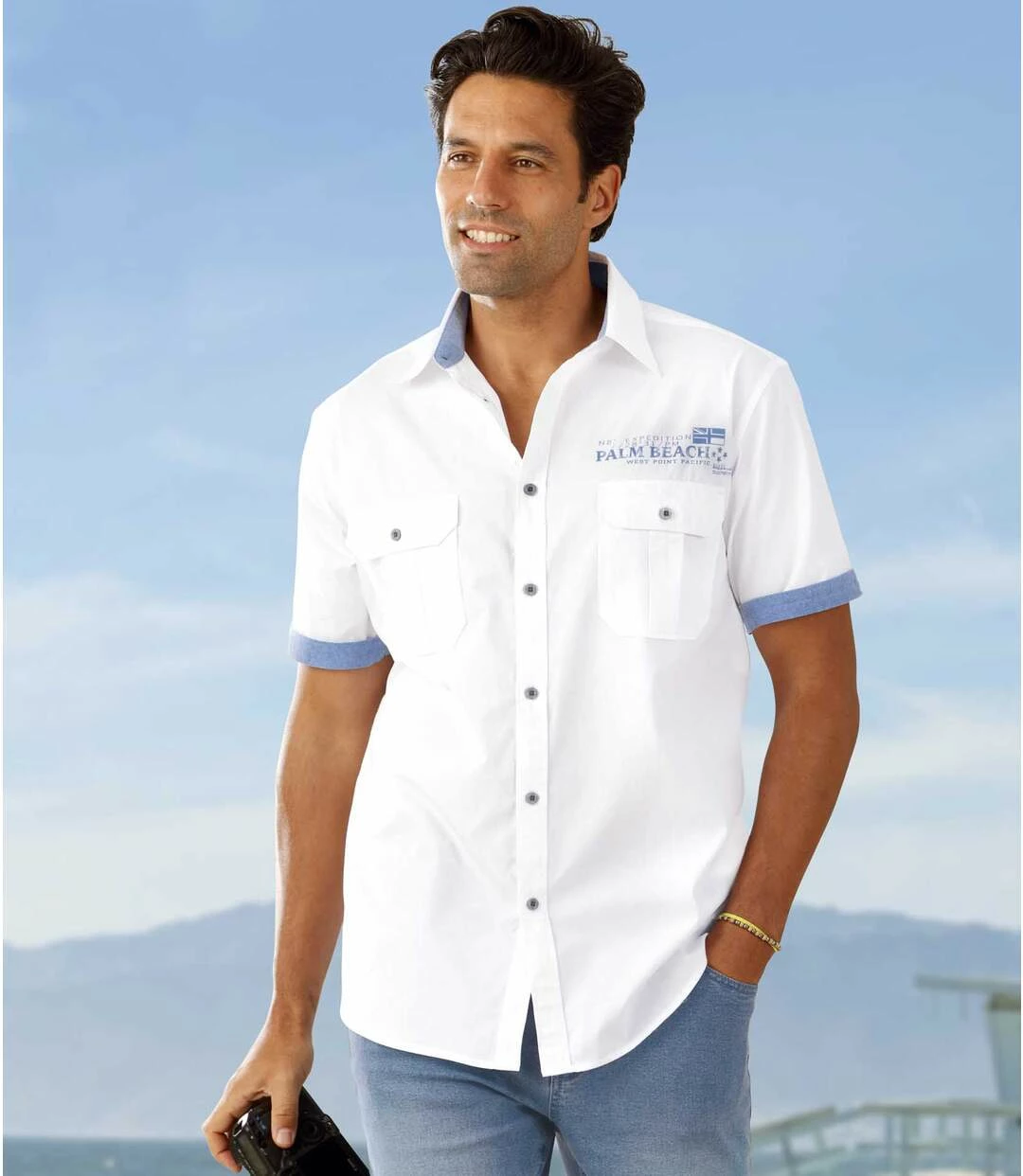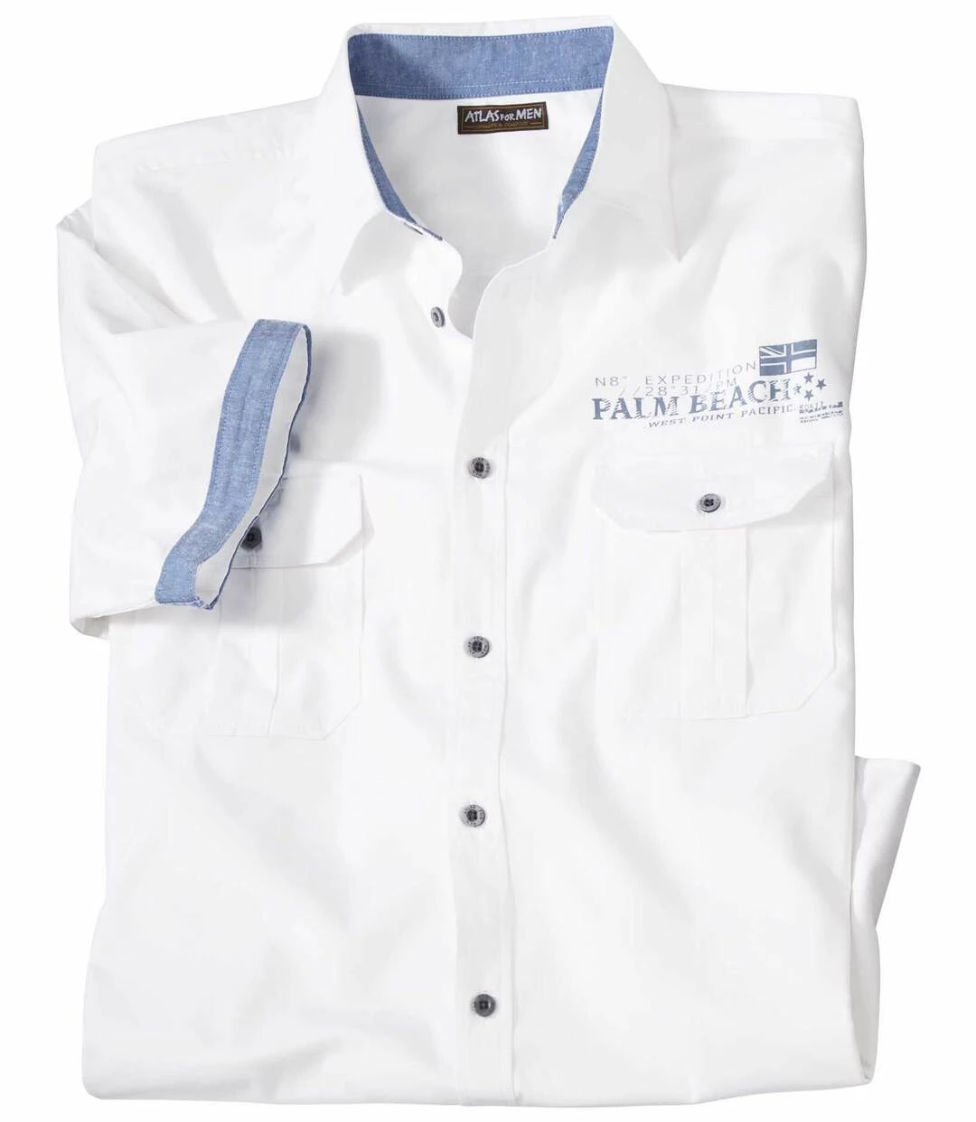 Leichtes Sommerhemd aus Popelin: Um diesen Sommerklassiker kommen Sie nicht herum: das weiße Popelinhemd. Die kurzen Ärmel haben einen Saum, der mit Chambray-Stoff in Kontrastfarbe abgesetzt ist. Tragen Sie den Saum umgeschlagen im klassischen Stil oder sichtbar für ausgesprochen lässig-modischen Stil. Weiter Schnitt mit Rückenpasse und 2 Bewegungsfalten im Rücken. Dank des abgerundeten Saums können Sie das Hemd auch lässig über der Hose tragen. Kentkragen, 2 Brusttaschen mit Knopfklappe. Krageninnenseite und Ärmelsaum in Kontrastfarbe. Exklusiver Brustaufdruck. 100% Baumwolle. Rückenlänge bei Größe L: ca. 80 cm. Maschinenwaschbar bei 30°. Auf Links bügeln wegen des Aufdrucks. Farbe: Weiß – Art.-Nr.: V7010 07