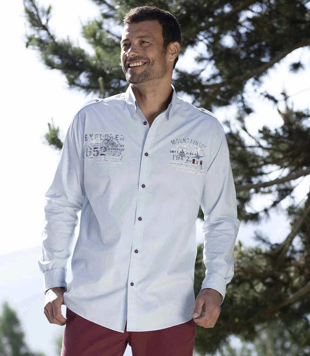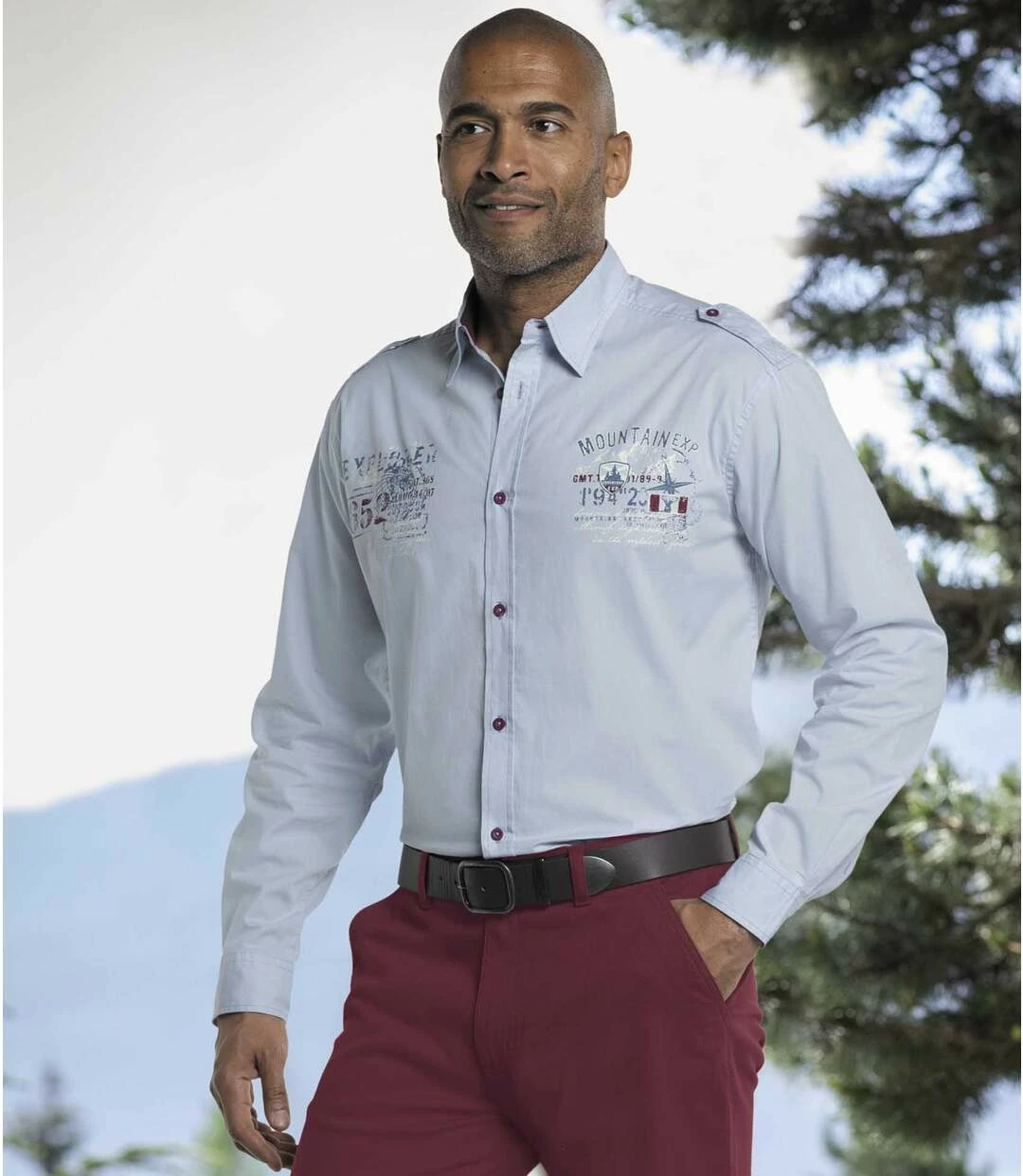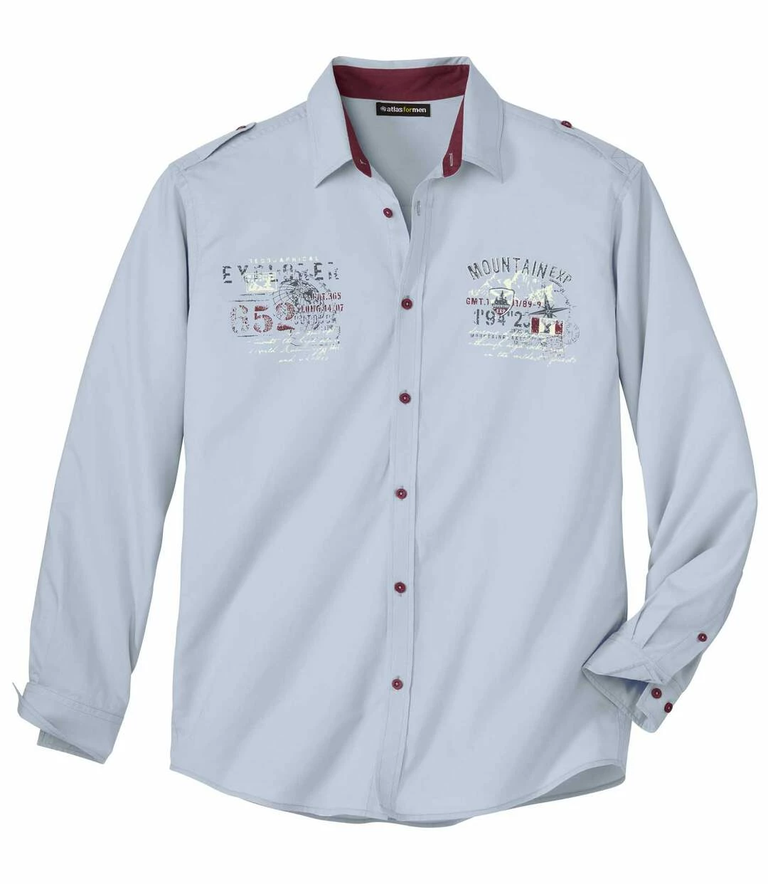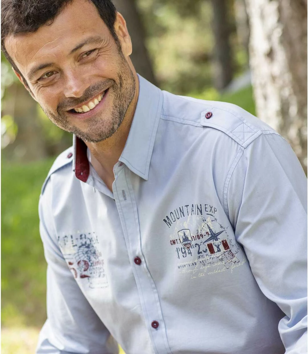Piloten-Hemd Mountain Exploration: Für das Design dieses langärmeligen Hemds aus Popelin (ca. 110 g/m²) standen die typischen Pilotenhemden Pate. Es überzeugt mit hochwertiger Verarbeitungsqualität: Die Innenseite des Kragens ist in kontrastierender Baumwolle abgesetzt, geknöpfte Schulterklappen, 2 exklusive Brustaufdrucke. Bequemer Schnitt mit 2 Bewegungsfalten im Rücken und abgerundetem Saum. Kentkragen. Gravierte Knöpfe in Kontrastfarbe. 100% Baumwolle. Rückenlänge bei Größe L: ca. 81 cm. Maschinenwaschbar bei 30°. Auf Links bügeln wegen der Aufdrucke. Farbe: Hellblau – Art.-Nr.: K8132