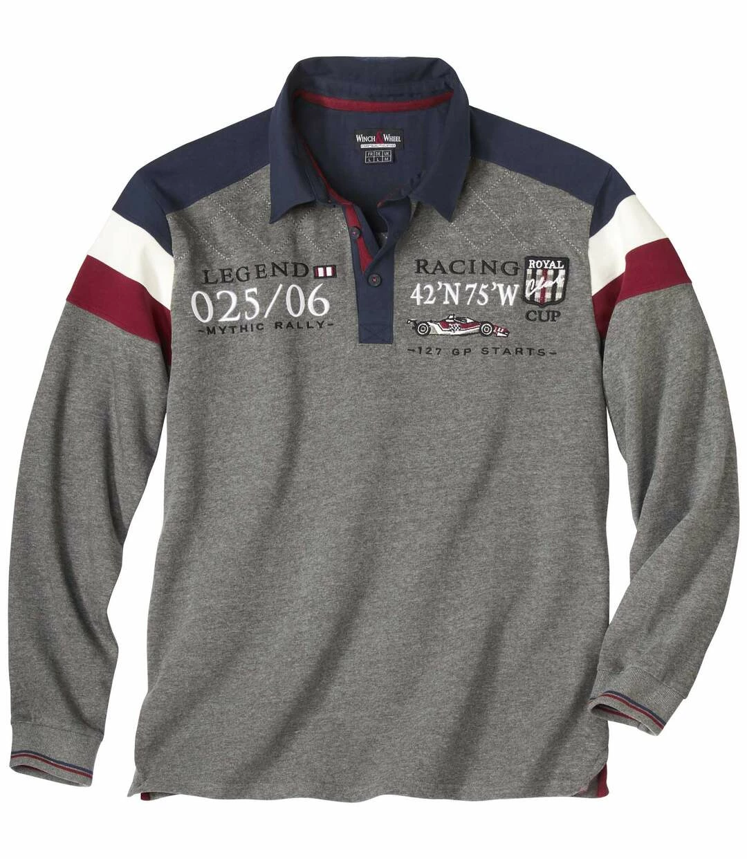 Poloshirt Race Start: Dieses langärmelige Poloshirt von Winch and Wheel ist wie eine Eintrittskarte in die Welt des Automobilsports! Das Modell mit sportlichem Chic wird aus hochwertiger Baumwolle (ca. 290 g/m²) hergestellt und zeigt markante Elemente wie Zierstreifen in Bordeaux, Rohweiß und Dunkelblau an den Oberarmen sowie modische Ziernähte im Brust- und Rückenbereich. Zahlreiche stylische Akzente tragen zum typischen Markenstil von Winch and Wheel bei: Stickereien und Webetiketten auf der Brust und der Unterseite des Kragens. Die Rippbündchen am Twillkragen und an den Ärmeln sind gedoppelt und mit schmalen Dekorstreifen aufgewertet. Hochwertige, detailverliebte Verarbeitung: bordeauxfarbene Ripsbänder (Unterseite der Knopfleiste, Nackenband, Seitenschlitze), dunkelblaue Knöpfe (W and W-Gravur) mit rotem Faden vernäht. Rückenlänge bei Größe L: ca. 74 cm. Maschinenwaschbar bei 30°. Farbe: Grau.