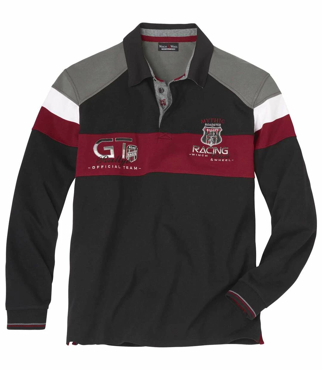 Poloshirt Rallye Team Club: Dieses langärmelige Poloshirt macht optisch einen Rallye-Piloten aus Ihnen! Es wird aus dicker, hochwertiger Baumwolle (ca. 290 g/m²) gefertigt und zeigt zahlreiche effektvolle Details, ganz im Stil von Winch and Wheel, wie die ausgesprochen edlen Stickereien auf der Brust und auf der Unterseite des Kragens. Die detailverliebte Verarbeitung steht dem in nichts nach: Kragen und Unterseite der Knopfleiste sind aus Chambray, Kontrasteinsätze im Schulterbereich, an den Oberarmen und auf der Brust. Nackeneinsatz und Einfassband sowie die mit Ripsband verstärkten Seitenschlitze sind ebenfalls in Kontrastfarben gehalten. Ärmel mit gestreiften Rippbündchen. Verarbeitung mit Doppelnähten. Knöpfe mit Gravur. 100% Baumwolle. Rückenlänge bei Größe L: ca. 74 cm. Maschinenwaschbar bei 30°. Farbe: Schwarz – Art.-Nr.: Y1142