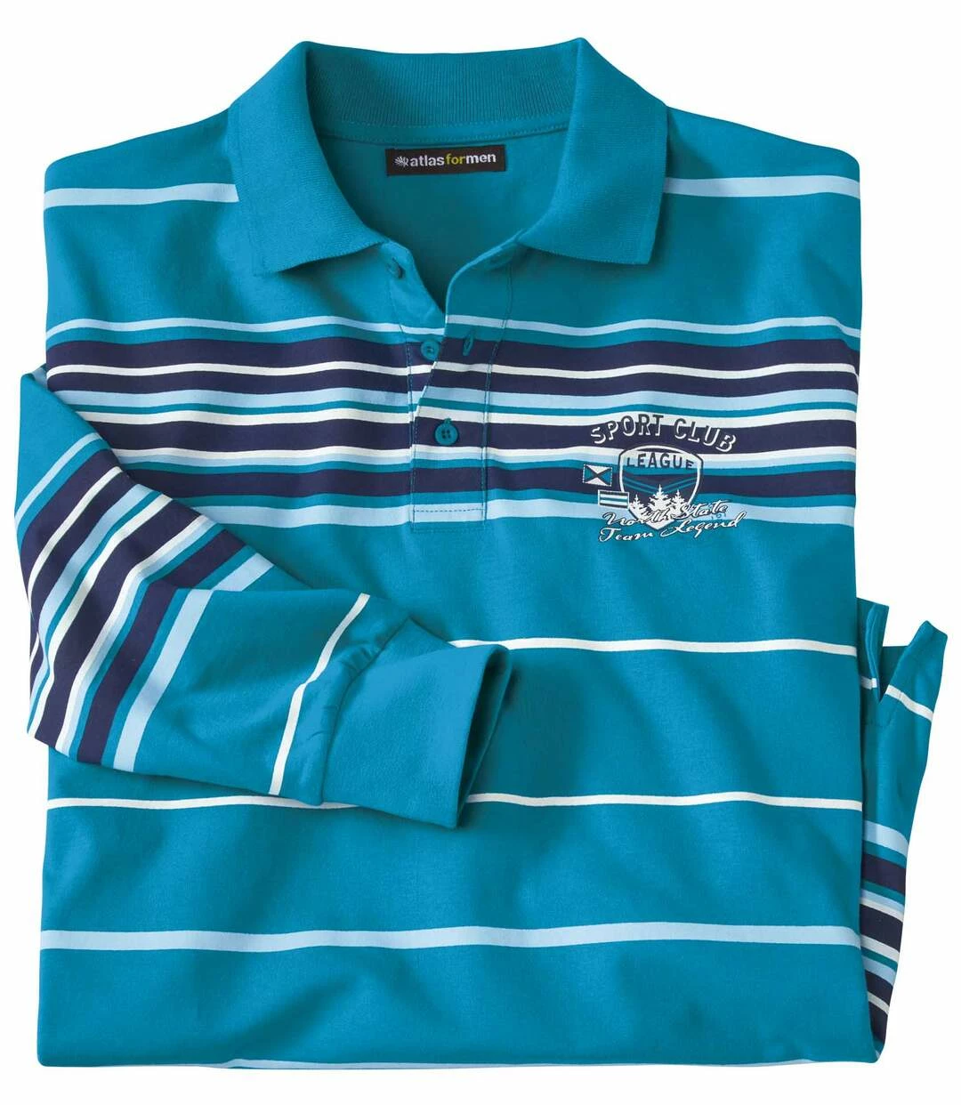 Poloshirt Sport Club: Dieses superbequeme, langärmelige Poloshirt wird aus weicher und anschmiegsamer Baumwolle (ca. 180 g/m²) gefertigt. Freuen Sie sich auf Formstabilität und Passform dank Rippbündchen am Kragen und an den Ärmeln sowie Seitenschlitzen am geraden Saum mit Doppelnähten. Modischer Brustaufdruck. Türkisfarbene Knöpfe. 100% Baumwolle. Rückenlänge bei Größe L: ca. 74 cm. Maschinenwaschbar bei 30°. Auf Links bügeln. Farben: Türkis mit Streifen in Dunkelblau und Natur – Art.-Nr.: K7124