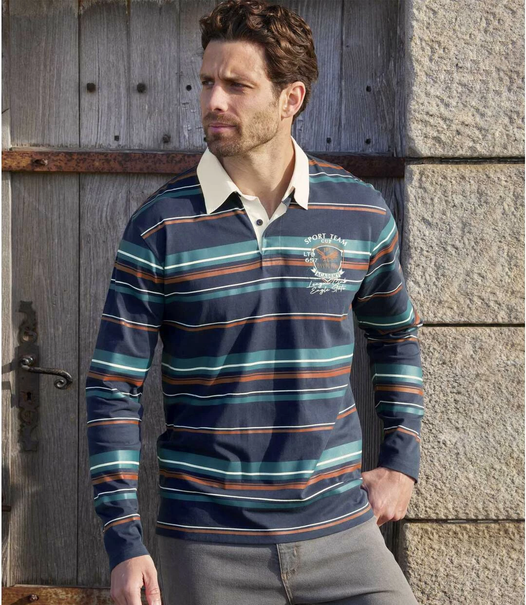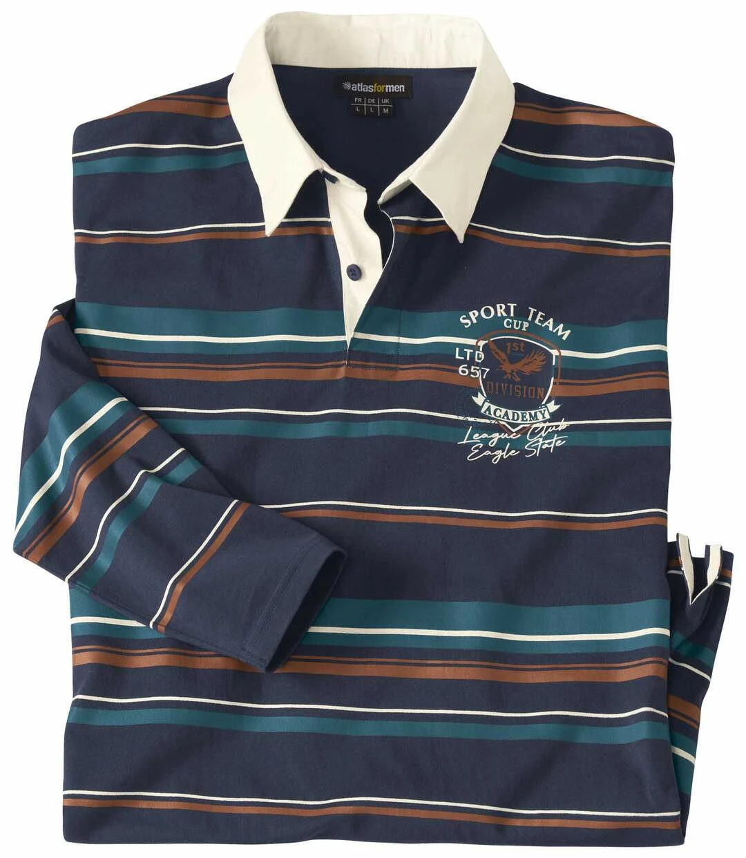 Poloshirt Sport Team im Rugby-Stil: Mit diesem Poloshirt bringen Sie Ihre sportliche Einstellung auch modisch zum Ausdruck! Das Modell mit den aufgedruckten Querstreifen wird aus herrlicher Baumwolle (ca. 180 g/m²) hergestellt und hat Seitenschlitze am Saum, die den Tragekomfort erhöhen. Der Kragen und die Unterseite der Knopfleiste sind aus naturfarbenem Twill. Lange Ärmel und Saum mit Doppelnähten. Modischer Brustaufdruck. Die Seitenschlitze sind mit Twill verstärkt. Rückenlänge bei Größe L. ca. 74 cm. Maschinenwaschbar bei 30°. Auf Links bügeln wegen des Aufdrucks. Farben: Dunkelblau mit Streifen.