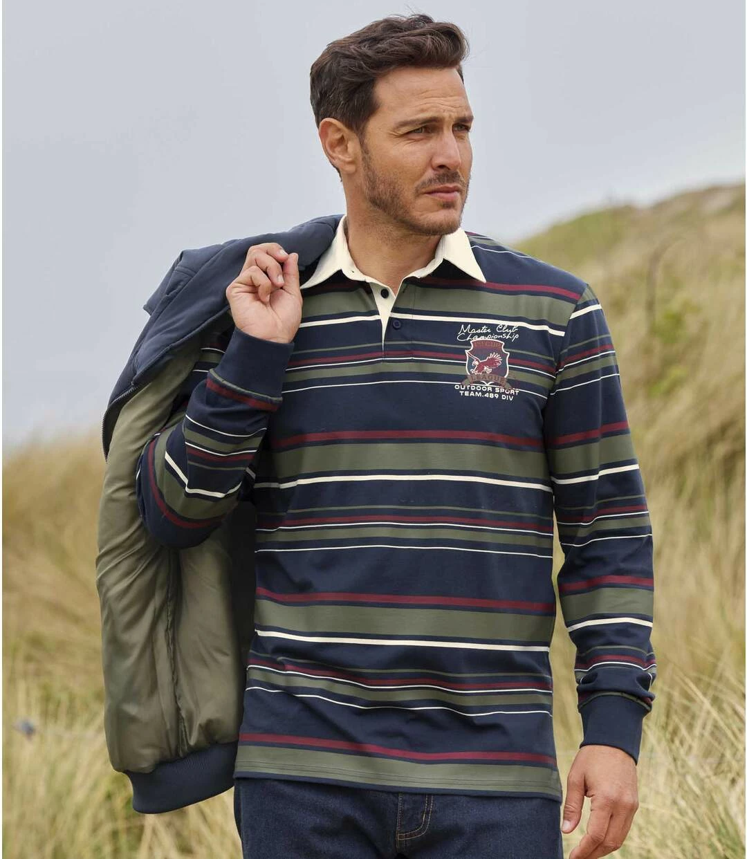 Poloshirts Master Club: Wenn Sie den sportlich lässigen Look bevorzugen, dann gönnen Sie sich dieses langärmelige Poloshirt aus herrlichem Jersey (ca. 180 g/m²), das die typischen Details eines perfekten Polostils zeigt: Kragen, Unterseite der Knopfleiste und Verstärkungen der Seitenschlitze aus Twill in Kontrastfarbe. Verarbeitung mit Doppelnähten. Brustaufdruck. 100% Baumwolle. Rückenlänge bei Größe L: ca. 74 cm. Maschinenwaschbar bei 30°. Farben: Dunkelblau mit Streifen in Bordeaux, Khaki, Natur – Art.-Nr.: K6118