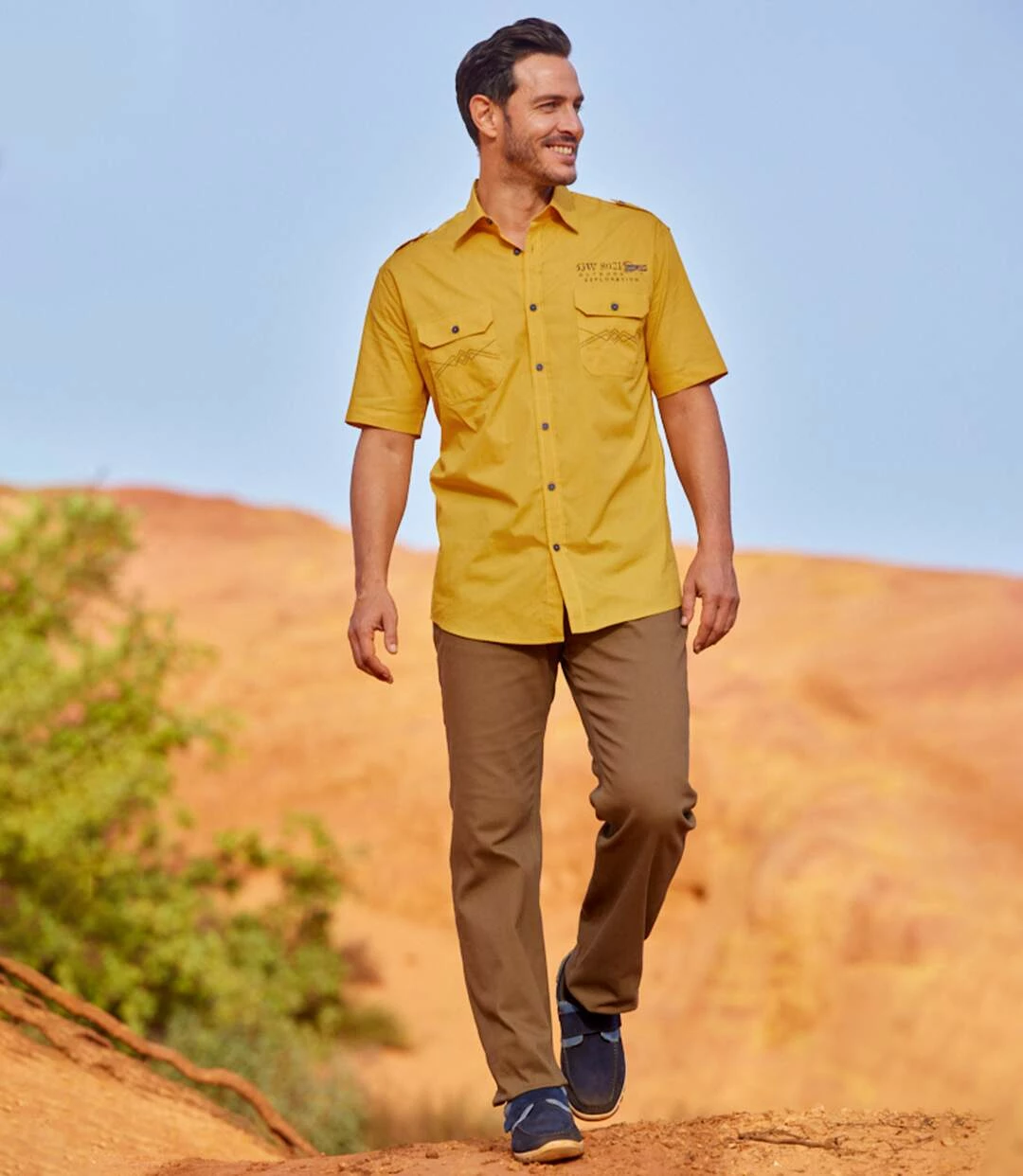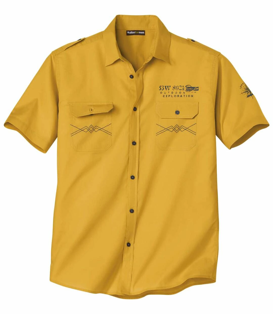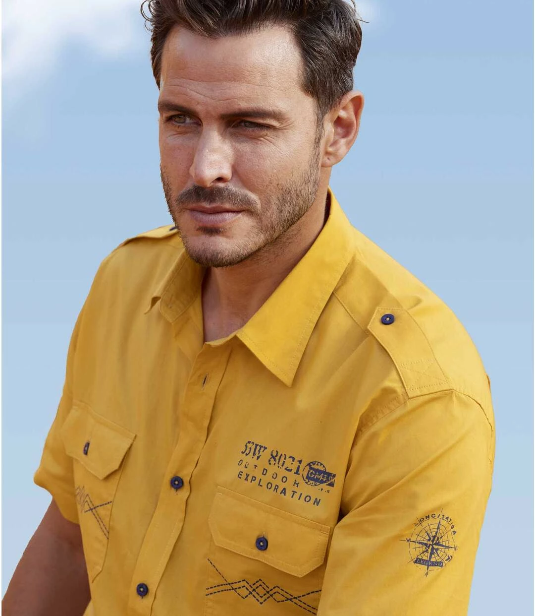 Popelin-Hemd im Piloten-Stil: Dieses Hemd sieht absolut nach Abenteuer aus, dank der trendigen Schulterklappen, der 2 Brusttaschen mit Knopfklappen und der markanten Aufdrucke auf der Brust, auf den Brusttaschen und am linken Ärmel. Dieses bequeme Hemd wird aus weichem Popelin (ca. 110 g/m²) gefertigt und hat 2 Bewegungsfalten im Rücken. Kentkragen, abgerundeter Saum, dunkelblaue Knöpfe. 100% Baumwolle. Rückenlänge bei Größe L: ca. 80 cm. Maschinenwaschbar bei 30°. Auf Links bügeln wegen der Aufdrucke. Farbe: Gelb – Art.-Nr.: L3131