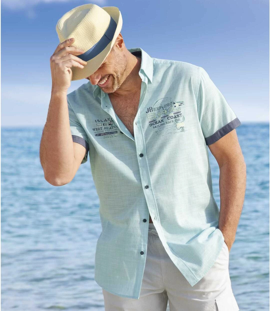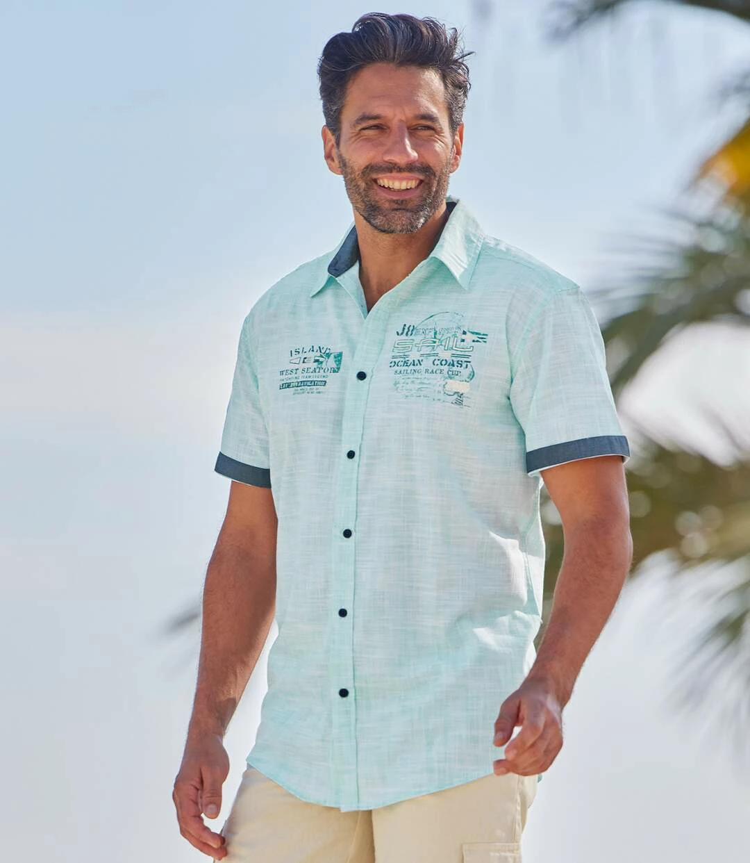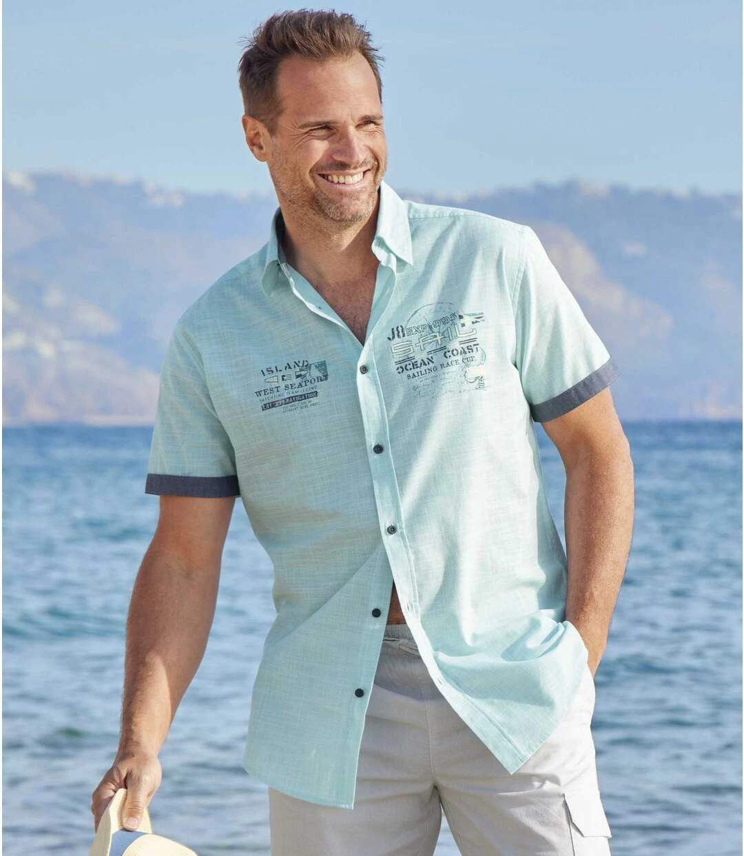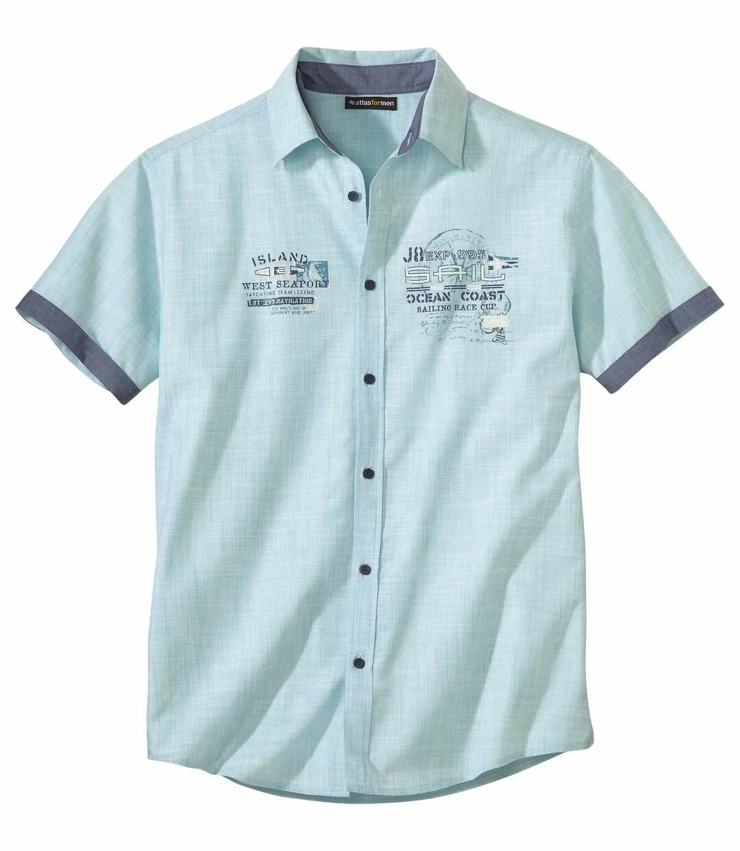 Popelin-Hemd mit nautischen Motiven: Schlüpfen Sie in dieses Hemd aus geflammtem Popelin (ca. 110 g/m²) und Sie spüren die entspannte Stimmung eines Sommertages am Meer! Die tollen Brustaufdrucke mit nautischen Motiven und die Details in blauem Chambray (Ärmelaufschläge und Kragenfuß) verströmen Segel-Ambiente. Ein superbequemes und top modisches Modell! Kentkragen. Blaue Knöpfe. Rückenpasse mit 2 Bewegungsfalten und abgerundetem Saum. 100% Baumwolle. Rückenlänge bei Größe L: ca. 80 cm. Maschinenwaschbar bei 30°. Auf Links bügeln wegen des Aufdrucks. Farbe: Hellblau – Art.-Nr.: K1121