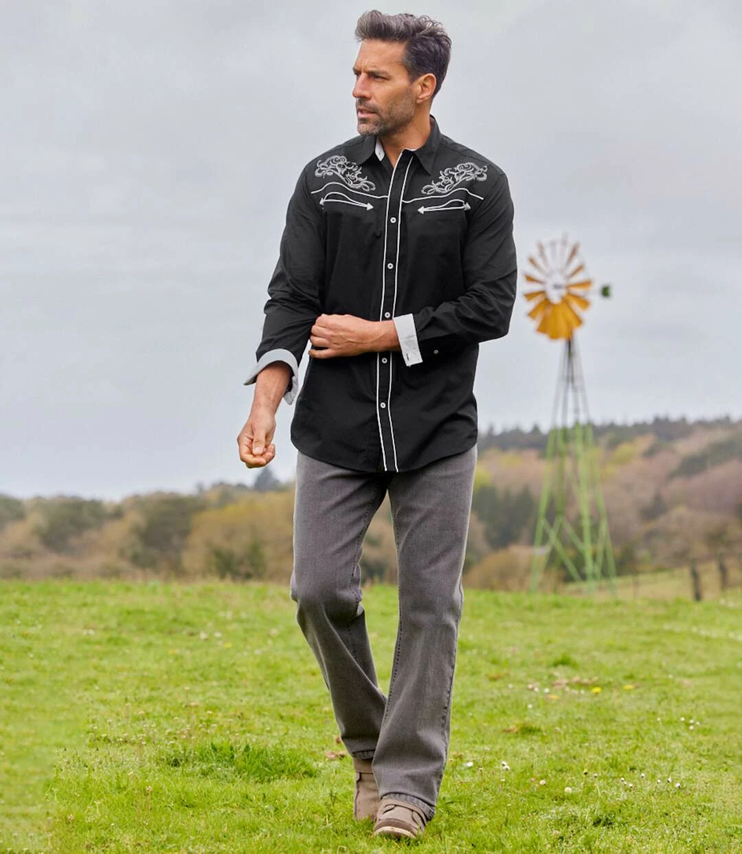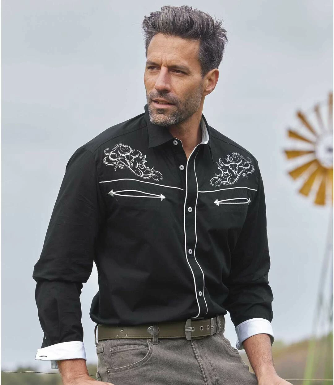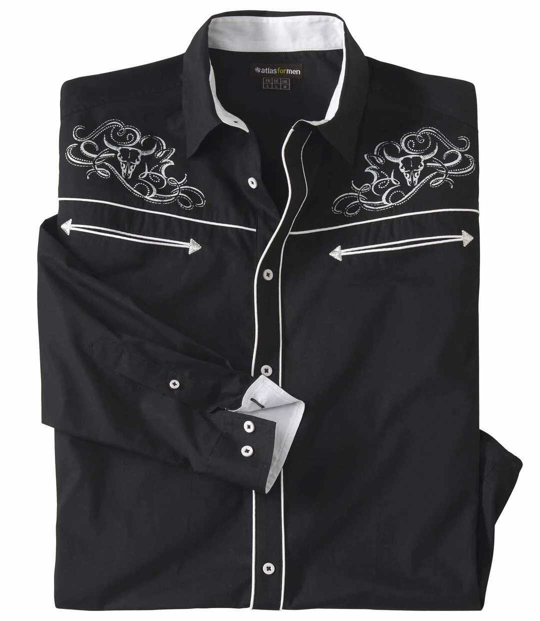 Popelinhemd im Western-Style: Wecken Sie den Cowboy, der in Ihnen schlummert, mit diesem Hemd aus herrlichem Popelin (ca. 110 g/m²)! Freuen Sie sich auf typische Western-Details: aufgedruckte Arabesken im Schulterbereich, markante Brustpassen mit eingearbeiteten, paspelierten Brusttaschen im Western-Look, Innenseiten der Manschetten und des Kragens in Kontrastfarbe. Ein absolut stylisches Modell! Kentkragen und Knopfmanschetten. Rückenpasse mit 2 Bewegungsfalten, abgerundeter Saum. Rückenlänge bei Größe L: ca. 81 cm. Maschinenwaschbar bei 30°. Auf Links bügeln wegen des Aufdrucks. Farbe: Schwarz.