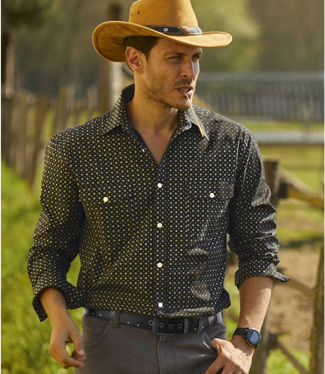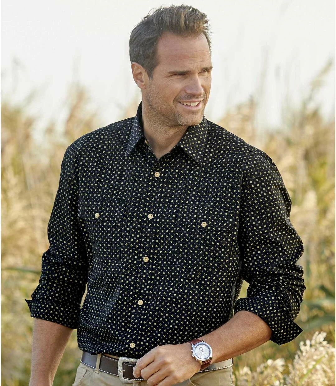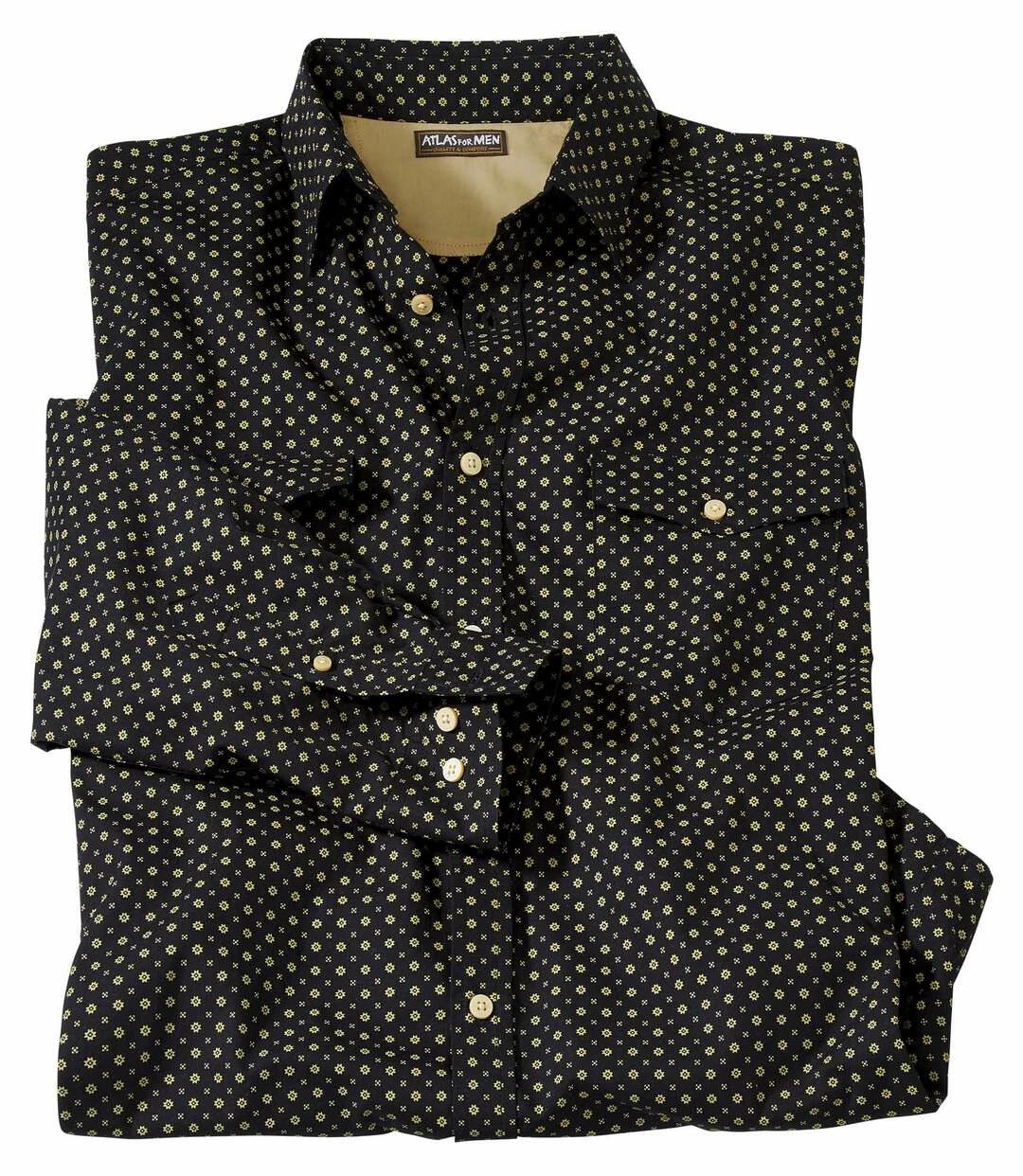 Popelinhemd mit Musterdruck: Dieses Hemd in klassischem Schwarz begeistert mit seinem dezenten Druckmuster! Das Modell ist aus weichem Popelin (ca. 110 g/m²). Weiter, bequemer Schnitt mit 2 Bewegungsfalten im Rücken und abgerundetem Saum, Kentkragen, 2 aufgesetzten Brusttaschen mit Knopfklappen, Knopfmanschetten. Nackeneinsatz in Kontrastfarbe. 100% Baumwolle. Rückenlänge bei Größe L: ca. 81 cm. Maschinenwaschbar bei 30°. Auf Links bügeln. Farbe: Schwarz, bedruckt – Art.-Nr.: F0127