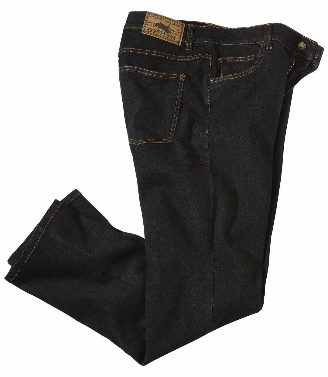 Schwarze Regular-Jeans mit Stretch-Effekt: Eine schwarze Jeans wie diese gehört zur Standard-Ausstattung für Männer. Das gerade geschnittene Modell aus solidem und bequemem Stretch-Denim (11 oz) eignet sich für alle Figurtypen. Einwandfreie Verarbeitung: Bund mit Schlaufen und Reißverschluss inkl. Abschlussknopf aus Metall, 2 Einstecktaschen und 1 Münztasche mit Nieten vorne und 2 aufgesetzte Gesäßtaschen. Ockerfarbene Nähte. Schrittlänge bei Größe 50: ca. 86 cm, Fußweite: ca. 22 cm. Maschinenwaschbar bei 30°. Farbe : Schwarz.