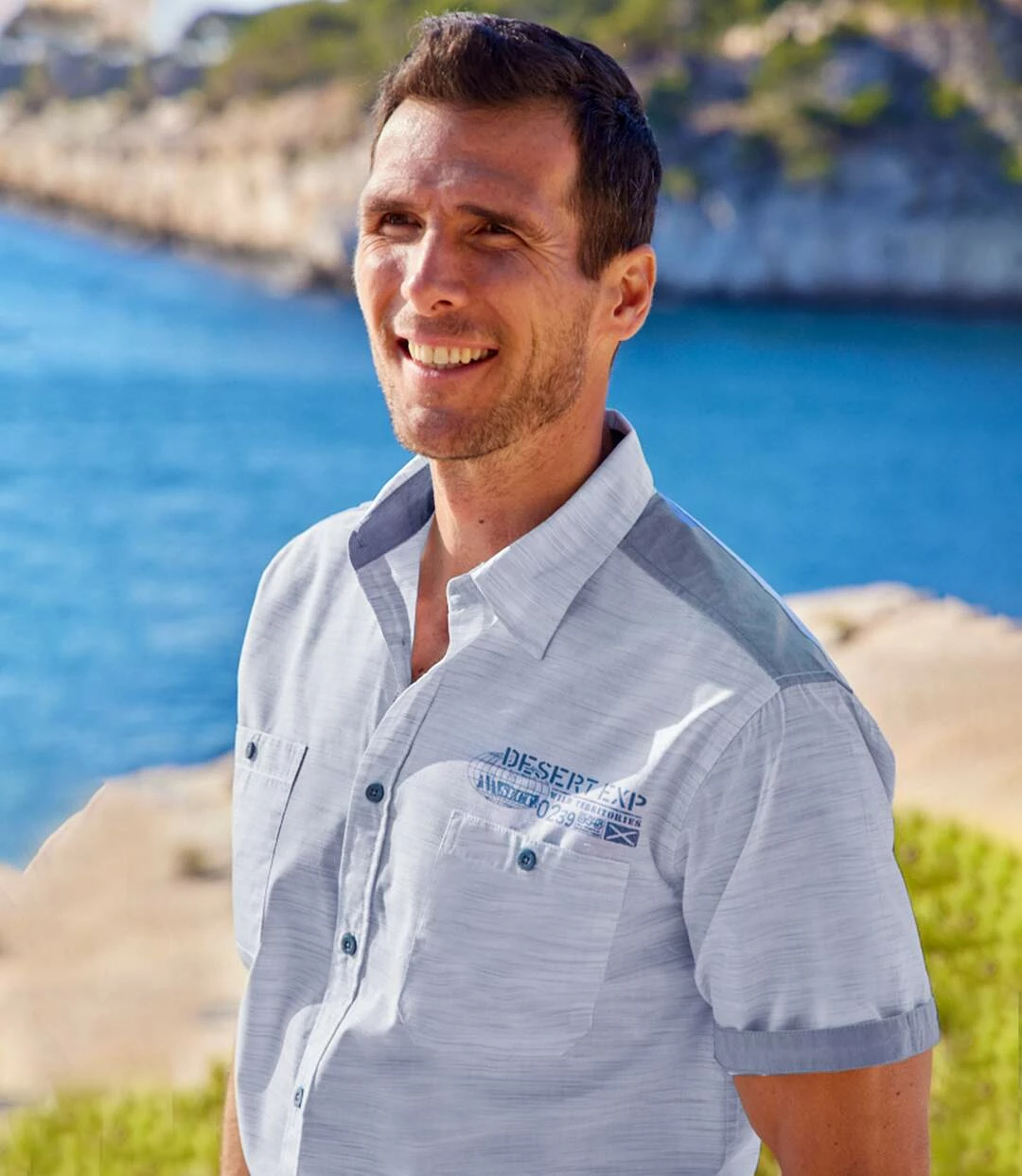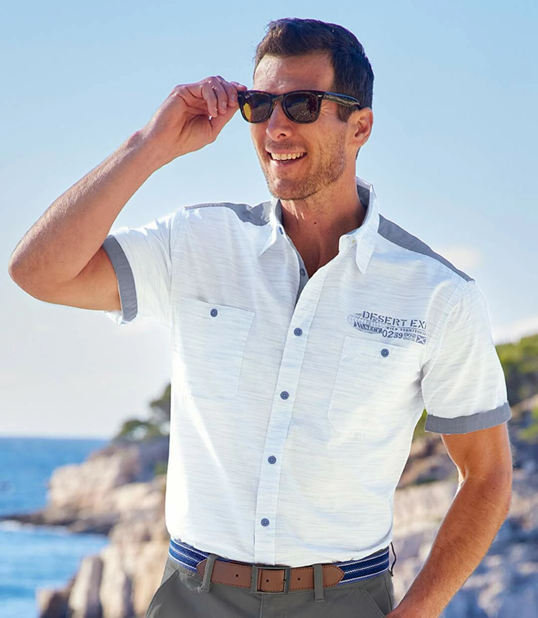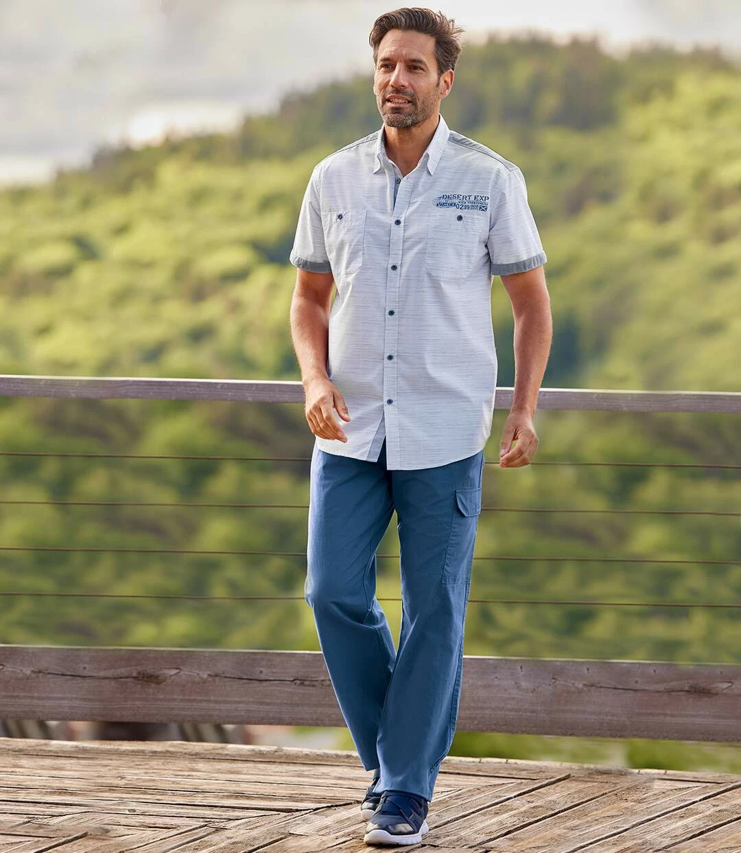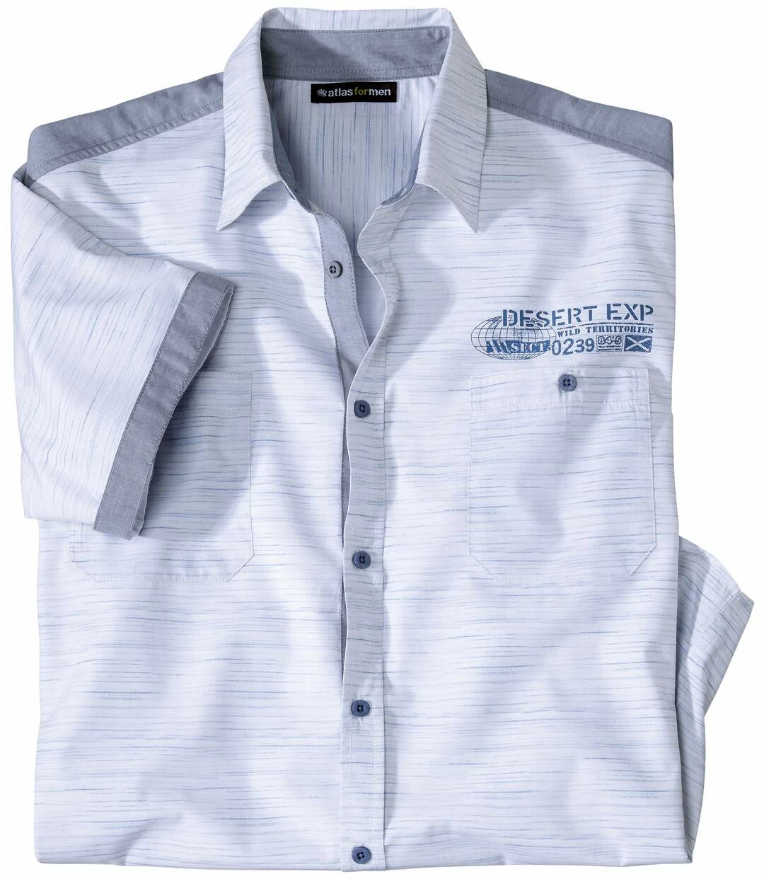 Sommerhemd Expedition in geflammter Optik : Gönnen Sie sich mit diesem stylischen Sommerhemd aus leichtem Stoff in geflammter Optik (ca. 110 g/ m2) einen eindrucksvoll lässigen Auftritt! Das Modell besitzt 2 geknöpfte Brusttaschen, einen exklusiven Brustaufdruck sowie weitere Kontrastdetails aus Popelin: Revers an den kurzen Ärmeln, Unterseite der Knopfleiste, Schultereinsätze, Krageninnenseite. Bequemer Schnitt: Kentkragen, 2 Bewegungsfalten im Rücken, abgerundeter Saum. Knöpfe in Kontrastfarbe. 60% Baumwolle, 40% Polyester. Rückenlänge bei Größe L: ca. 80 cm. Maschinenwaschbar bei 30°. Farbe: Hellblau meliert – Art.-Nr.: K4112