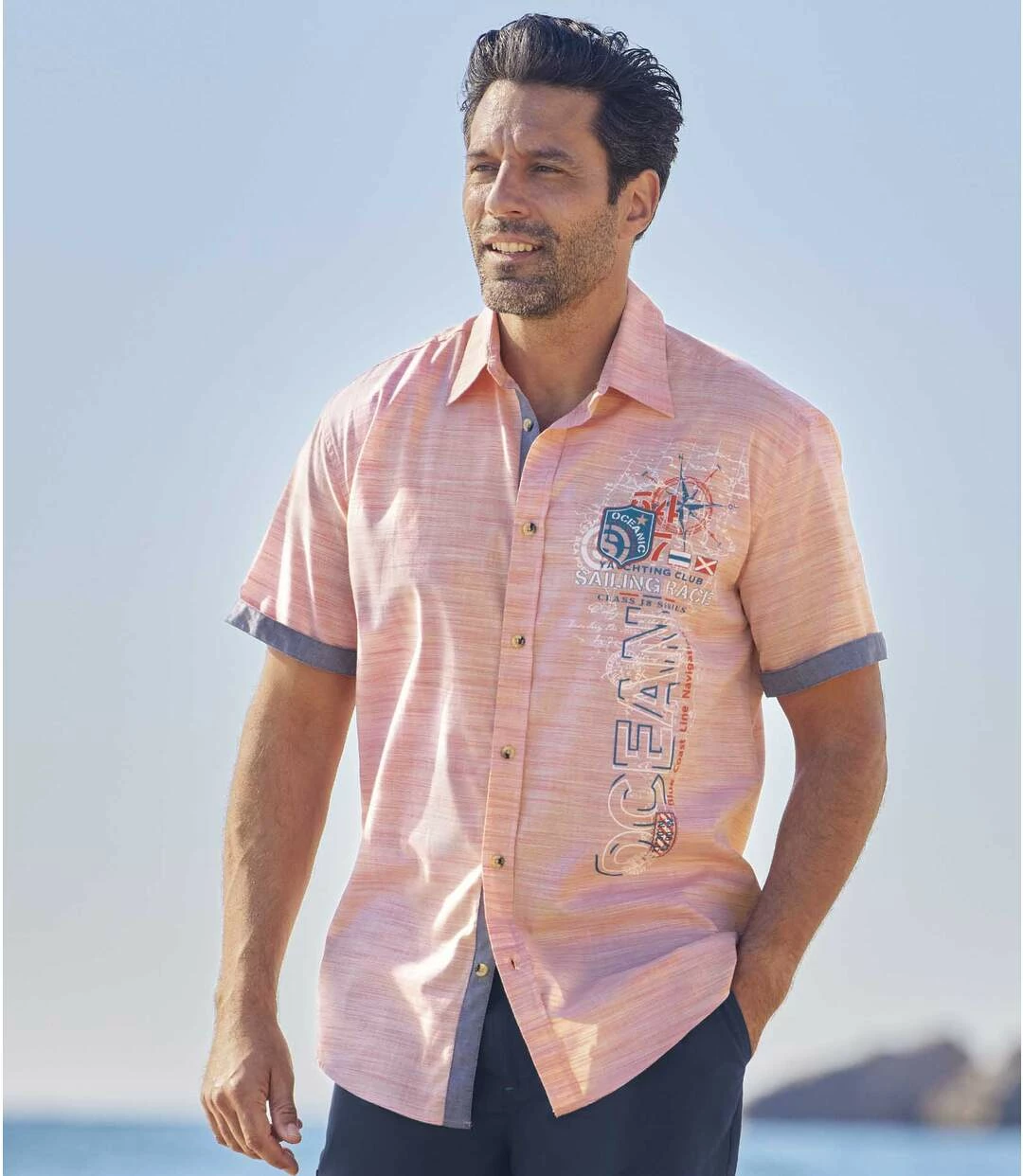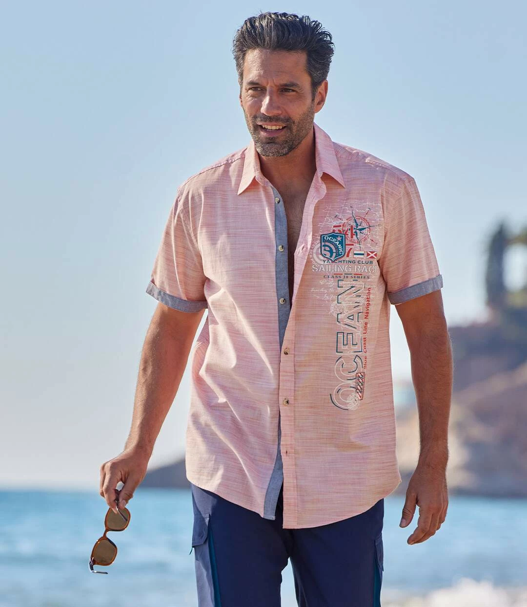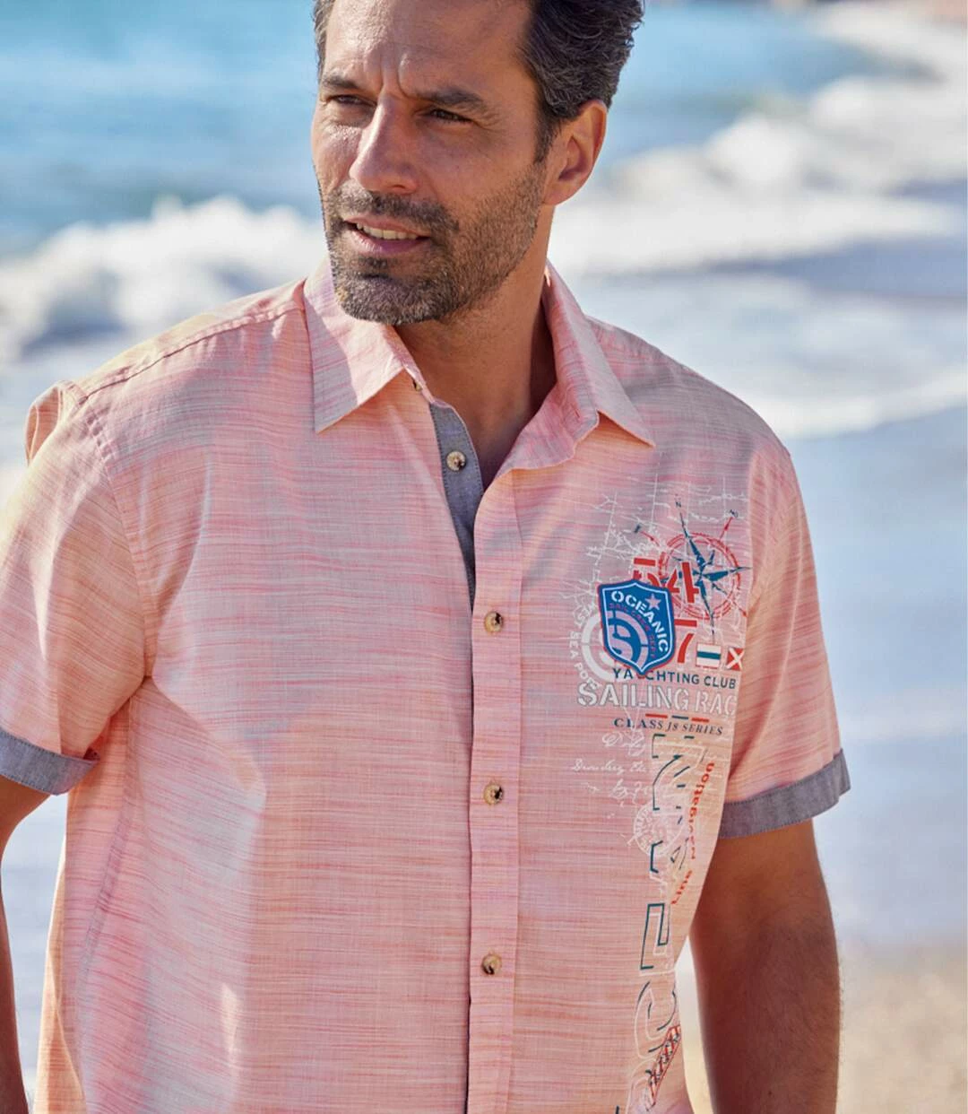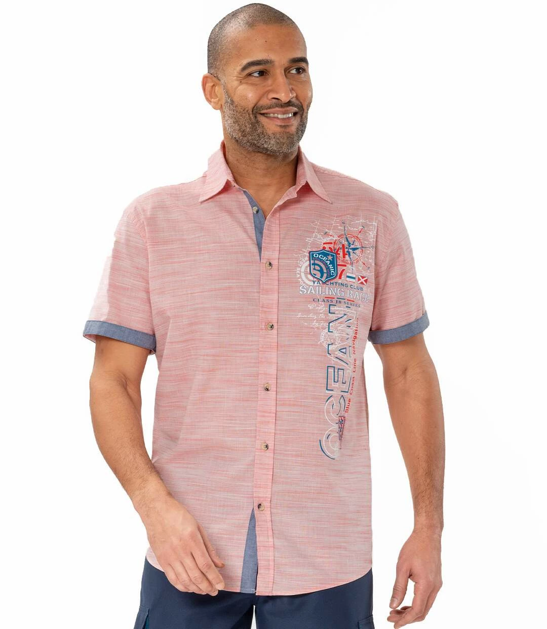 Sommerhemd Palma aus geflammtem Popelin: Das ist Sommer-Look durch und durch! Dieses kurzärmelige Hemd aus weichem, leichtem und geflammtem Popelin (ca. 110 g/m²) weist zahlreiche modische Details auf: Die Unterseite der Knopfleiste sowie die Revers sind aus Chambray in Kontrastfarbe. Die Revers können Sie lässig umschlagen oder – für mehr Chic – sichtbar tragen. Schöner Aufdruck auf der Brust. Weiter Schnitt mit 2 Bewegungsfalten im Rücken und abgerundetem Saum. Kentkragen. 100% Baumwolle. Rückenlänge bei Größe L: ca. 80 cm. Maschinenwaschbar bei 30°. Auf Links bügeln wegen des Aufdrucks. Farbe: Rot meliert
