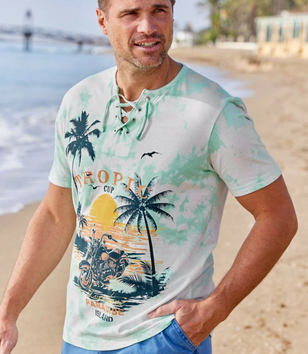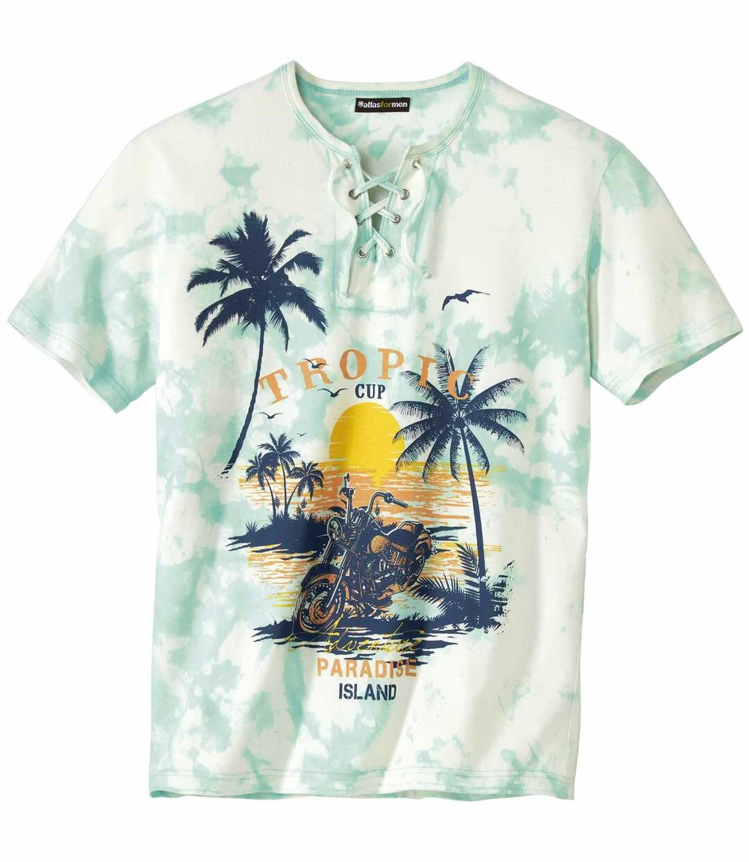 T-Shirt mit Schnürung und Aufdruck Biker’s Paradise: Mit der lässigen Schnürung am Ausschnitt und dem tropischen Druckmotiv auf dem Fond im Batik-Look kommt unwiderstehliche Urlaubsstimmung auf! Dank der weichen Baumwolle (ca. 160 g/m²) trägt sich dieses originelle T-Shirt sehr angenehm. Rundhalsausschnitt mit Schnürung in 8 Metallösen. Kurze Ärmel und gerader Saum mit Doppelnähten. 100% Baumwolle. Rückenlänge bei Größe L: ca. 74 cm. Maschinenwaschbar bei 30°. Auf Links bügeln wegen des Aufdrucks. Farben: Pastellgrün und Weiß.