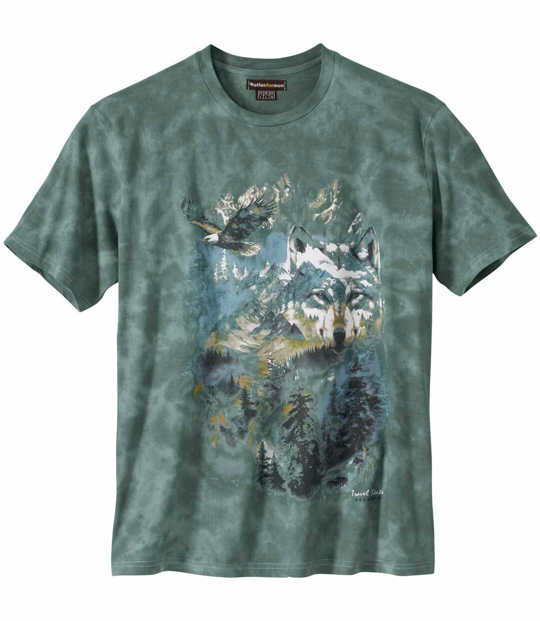 T-Shirt mit Wolfsmotiv im Batik-Look: Den Fond in Grüntönen im Batik-Look ziert ein herrliches Wolfsmotiv. Für Tragekomfort sorgt die weiche und anschmiegsame Baumwolle (ca. 160 g/m²). Weiter Schnitt und sorgfältige Verarbeitung: Nackenband, Rundhalsausschnitt mit Rippbündchen, kurze Ärmel und Saum mit Doppelnähten. Rückenlänge bei Größe L: ca. 74 cm. Maschinenwaschbar bei 30°. Auf Links bügeln wegen des Aufdrucks. Farbe: Grün.