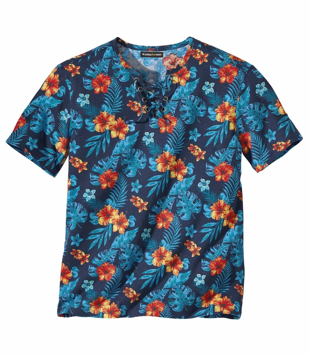 T-Shirt Polynesien mit geschnürtem Ausschnitt: Bei dem farbenprächtigen, exotischen Aufdruck im Südsee-Style dieses T-Shirts kommt unweigerlich Urlaubsstimmung auf! Genießen Sie die weiche, anschmiegsame Baumwolle (ca. 160 g/m²) und den tollen Look dieses superbequemen Modells. Rundhalsausschnitt mit Rippbündchen und Schnürung in 8 Ösen. Kurze Ärmel und Saum mit Doppelnähten. 100% Baumwolle. Rückenlänge bei Größe L: ca. 74 cm. Maschinenwaschbar bei 30°. Auf Links bügeln wegen des Aufdrucks. Farben: Dunkelblau, Motivdruck in Entenblau, Türkis und Korallenrot – Art.-Nr.: K3101