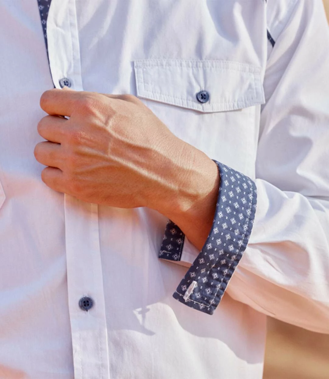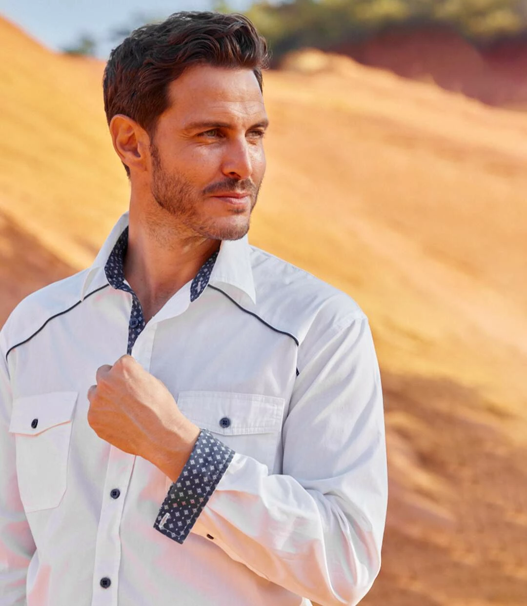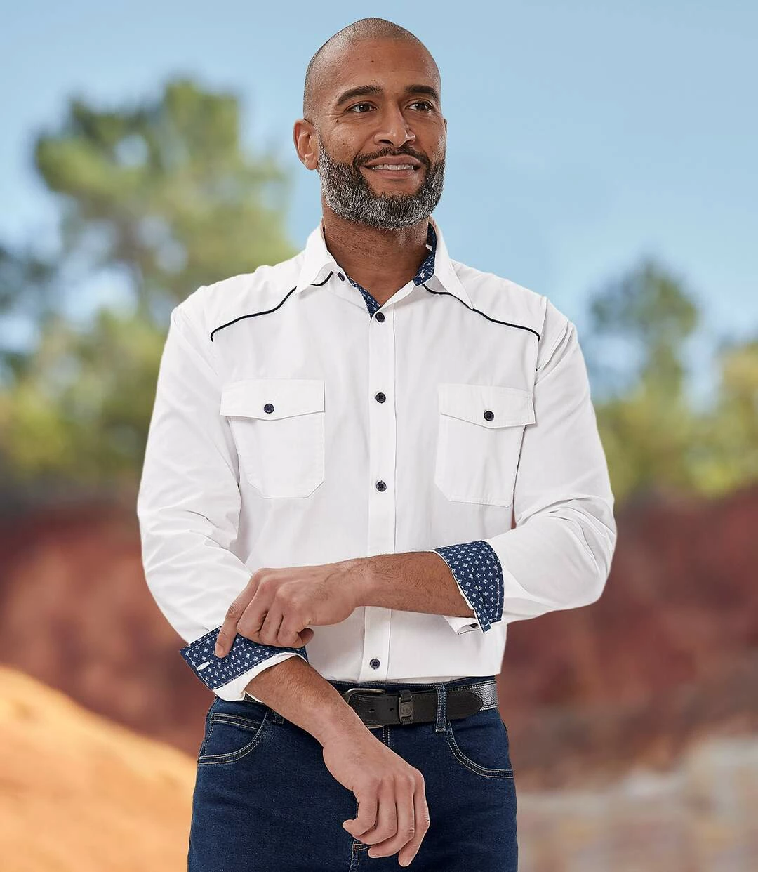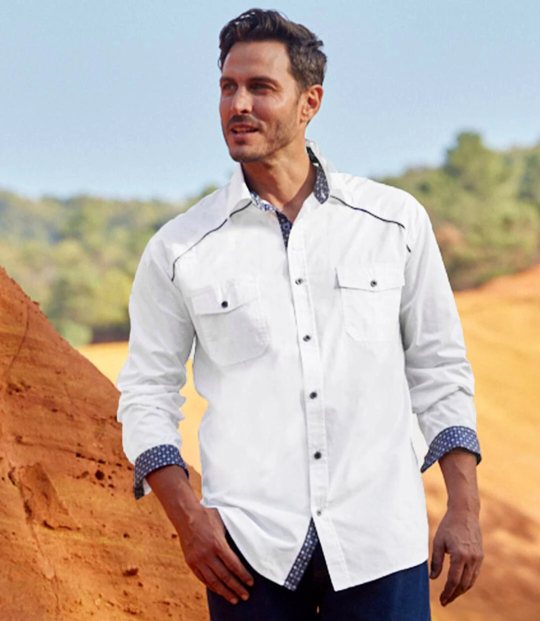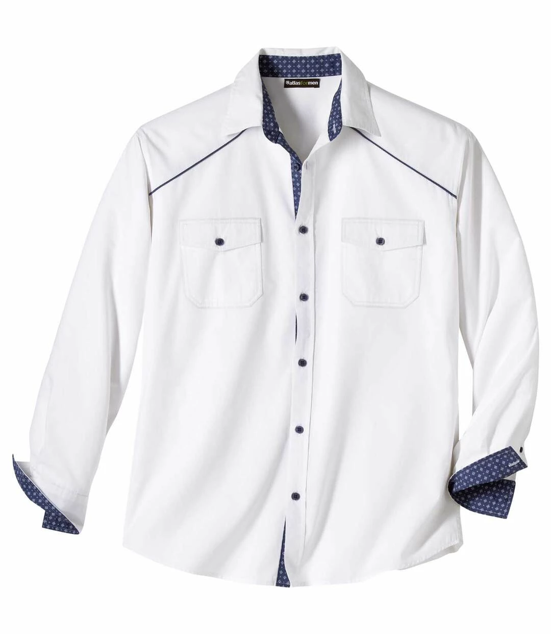 Weißes Hemd Country-Style: Dieses herrliche Hemd aus weichem Popelin (ca. 120 g/m²) verdankt seine Originalität den Kontrastdetails. Es hat 2 Brusttaschen mit Knopfklappen und die Schulterpassen sind mit einer dunkelblauen Paspel akzentuiert. Außerdem sind die Innenseiten des Kragens und der Manschetten sowie die Unterseite der Knopfleiste mit Popelin mit Micromotiv abgesetzt. Ein stylisches Modell, das perfekt verarbeitet ist: Kentkragen, Knopfmanschetten, 2 Bewegungsfalten im Rücken, abgerundeter Saum. 100% Baumwolle. Rückenlänge bei Größe L: ca. 81 cm. Maschinenwaschbar bei 30°. Farbe: Weiß – Art.-Nr.: L3114