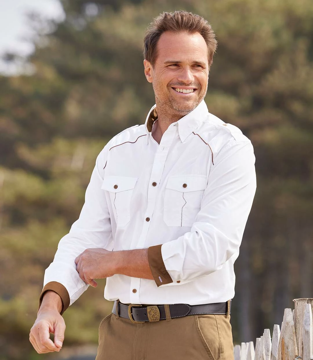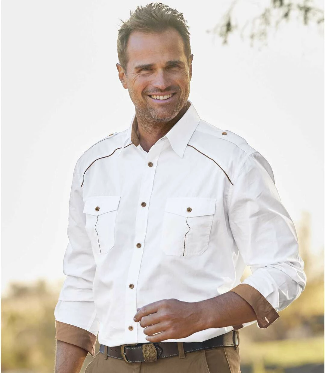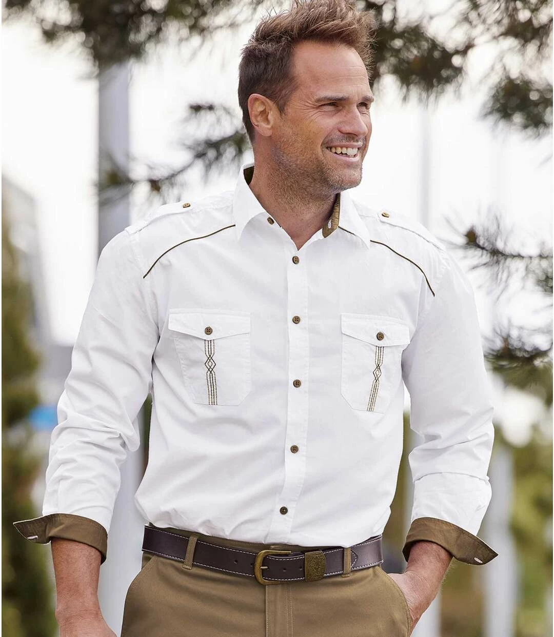 Weißes Popelinhemd: Dieses langärmelige Hemd besticht mit aufwändigen Details, die ihm seinen unverwechselbaren Stil verleihen: braune Paspeln auf der Brust, geknöpfte Schulterklappen, Kragen und Manschetten sind auf der Innenseite mit braunem Popelin abgesetzt und die Brusttaschen mit Knopfklappe zieren dezente Stickereien. Für Tragekomfort sorgt der herrlich weiche Popelin (ca. 120 g/m²). Weiter Schnitt, 2 Bewegungsfalten im Rücken, abgerundeter Saum. 100% Baumwolle. Rückenlänge bei Größe L: ca. 81 cm. Maschinenwaschbar bei 30°. Farben: Weiß, Details in Braun – Art. Nr.: F8139